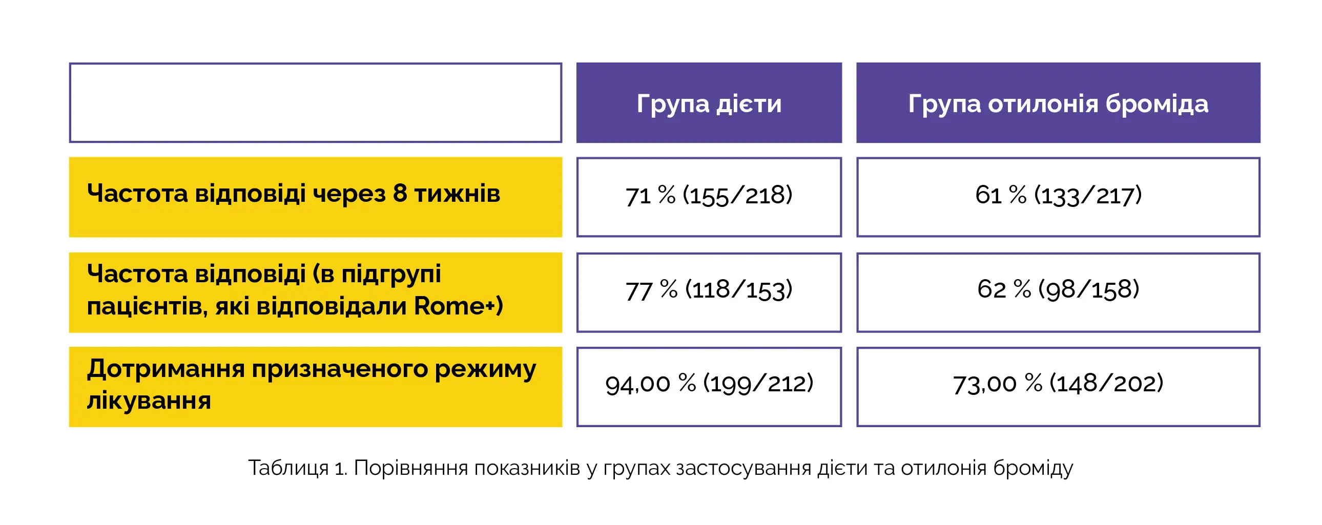 Для участі у дослідженні рандомізували 459 пацієнтів із СПК (середній вік: 41±15 років, 76% жінок, 70% відповідали критеріям Rome+). Через 8 тижнів частота відповіді у групі застосування дієти була статистично значуще вищою порівняно з групою застосування отілонію броміду, при цьому відмінність була більш вираженою в підгрупі пацієнтів, які відповідали критеріям Rome+. Ступінь дотримання запропонованого режиму лікування був вищим у групі застосування дієти порівняно з групою застосування отилонію броміду (див. таблицю 1).