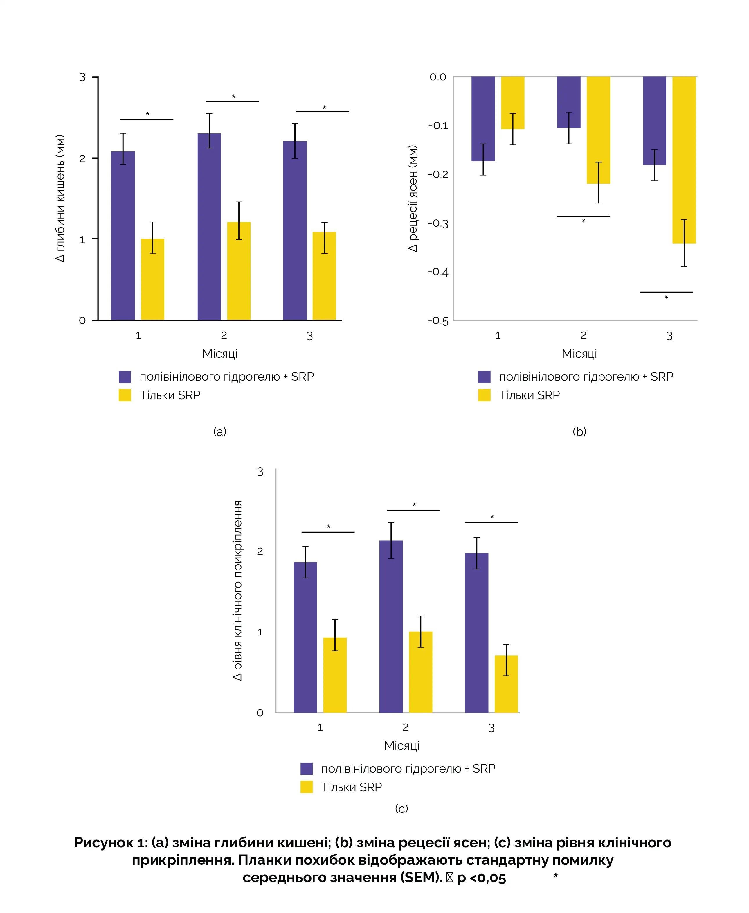 Результати дослідження вказували на виражені поліпшення різних показників стану пародонту (включаючи рівень клінічного прикріплення, рецесію ясен та глибину кишень) у пацієнтів, які отримували гель інноваційного полівінілового гідрогелю у поєднанні з SRP порівняно з пацієнтами, які проходили лише SRP. На малюнку 1 показані зміни глибини кишені, рецесії ясен та рівня клінічного прикріплення (у міліметрах) через 1, 2 та 3 місяці порівняно зі станом до лікування.