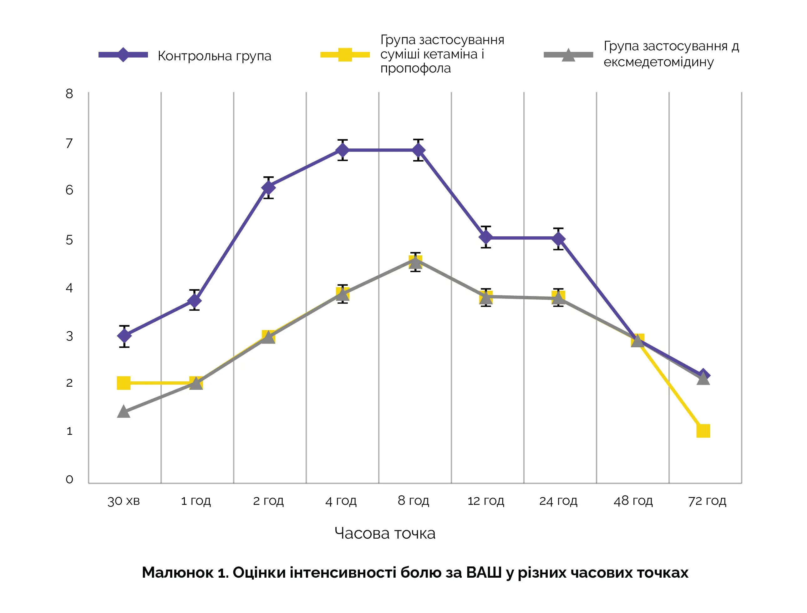 Основною кінцевою точкою дослідження була частота розвитку післяопераційного делірію. Додатковими кінцевими точками були частота розвитку післяопераційної ажитації (збудження), післяопераційного болю, обсяг застосування резервних опіоїдів, зміни показників гемодинаміки та розвиток небажаних явищ. У всіх часових точках частота розвитку післяопераційного делірію була статистично значуще нижче в групах D і K порівняно з групою C. Крім того, оцінки інтенсивності болю за візуальною аналоговою шкалою (ВАШ) у цих групах були статистично значуще нижчими в порівнянні з контрольною групою у всіх часових точках за винятком 48 і 72 годин після операції, коли у всіх трьох групах значення були зіставні (див. рисунок 1).
