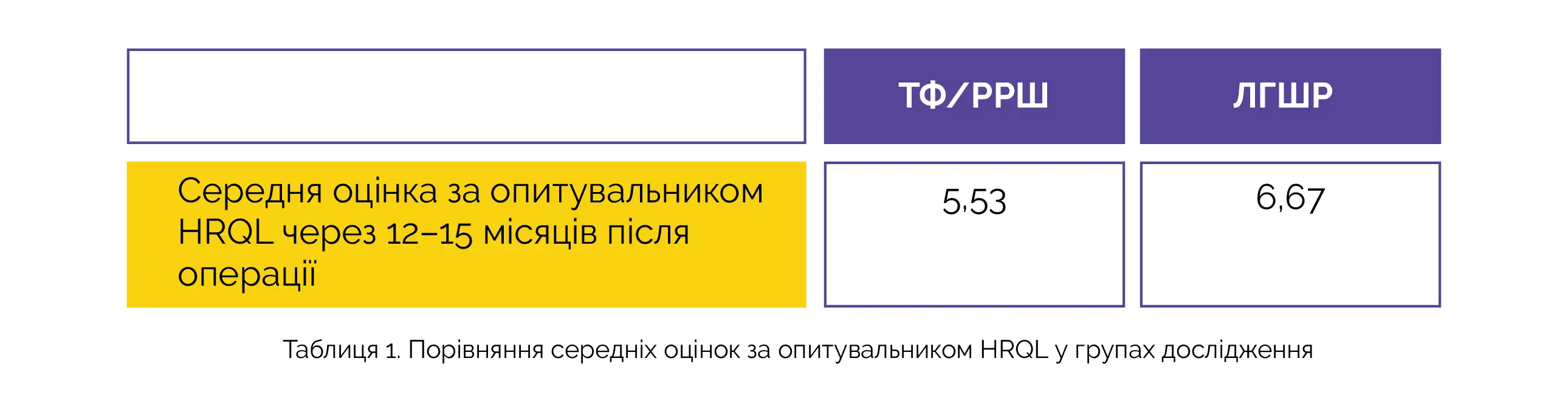 Середні оцінки до операції були наступними: застосування інгібіторів протонної помпи (ІПП) склало 93%, рівень задоволеності - 6,5%, оцінка за опитувальником HRQL - 32,53 бала та індекс RSI - 21,7. Середній ІМТ становив 45,99 в осіб, які пройшли ТФ/РРШ, і 42,27 - у групі ЛГШР. Результати оцінки через 12–15 місяців після проведення ТФ/РРШ та ЛГШР представлені у таблиці 1.