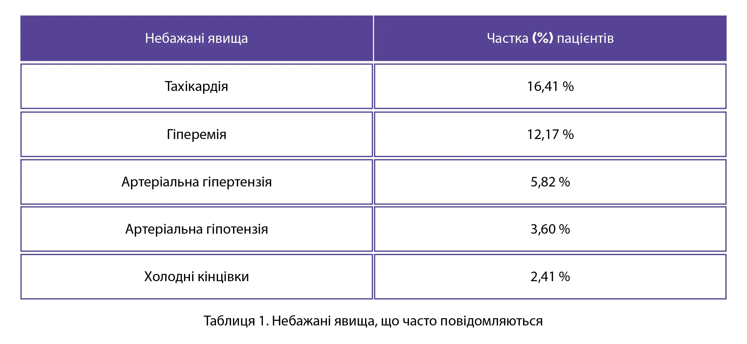 Були отримані повідомлення про розвиток 4863 небажаних явищ після введення вакцин Moderna, 1222 AstraZeneca, BNT162b2 Pfizer та інших вакцин проти коронавірусної інфекції. Найчастіші небажані явища, про які повідомлялося при застосуванні вакцин, наведено у таблиці 1.
