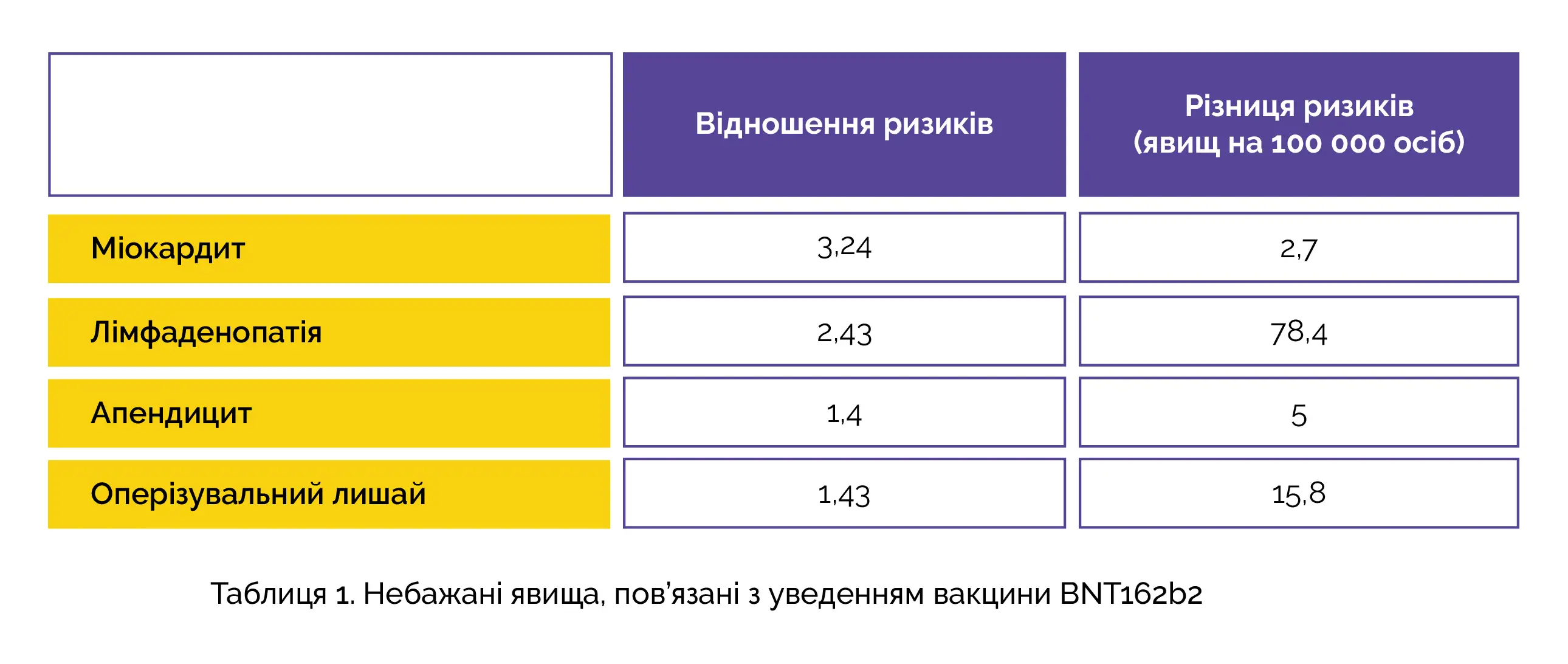 Для порівняння отриманих результатів аналогічна оцінка була проведена на підставі даних осіб, інфікованих коронавірусом порівняно з даними неінфікованих осіб. При оцінці результатів вакцинації та частоти інфікування коронавірусом оцінювали аналогічні небажані явища. При оцінці вакцинації контрольна група та група вакцинованих осіб включали в середньому 884 828 учасників. Було виявлено статистично значущий зв'язок вакцинації з підвищенням ризику розвитку міокардиту, лімфаденопатії, апендициту та оперізувального лишаю (див. таблицю 1).