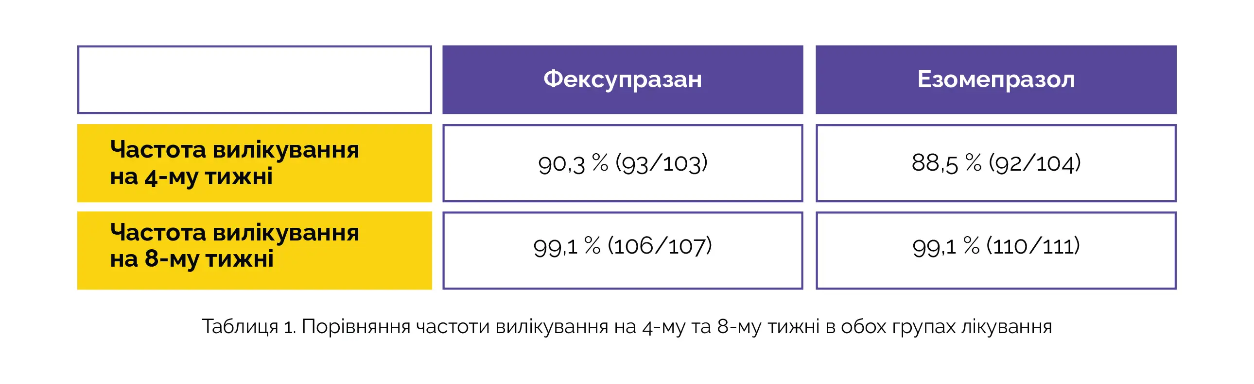 218 із 263 рандомізованих пацієнтів завершили дослідження відповідно до протоколу (фексупразан у дозі 40 мг, n = 107; езомепразол у дозі 40 мг, n = 111). На 8-му тижні було зазначено, що фексупразан мав не меншу ефективність, ніж езомепразол, з точки зору частоти вилікування. Однак між групами лікування не спостерігалося відмінностей щодо частоти вилікування ерозивного езофагіту на 4-му тижні з погляду відповіді з боку симптомів та оцінок якості життя (таблиця 1).