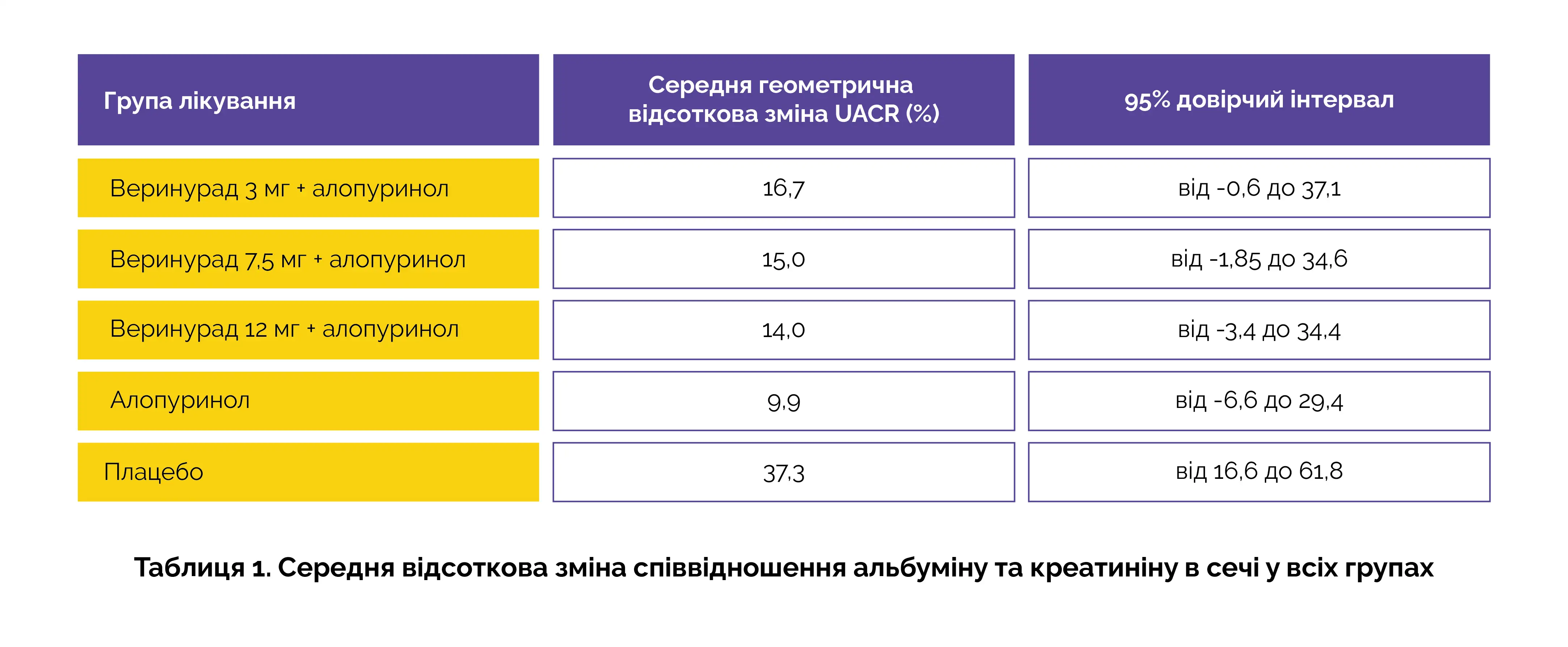 Застосування комбінації веринураду і алопуринолу сприяло значному зниженню рівня уратів у сироватці крові, але не призвело до значного зниження співвідношення альбуміну і креатиніну в сечі (UACR) і не сповільнило зниження розрахункової швидкості клубочкової фільтрації (РШКФ), що підтверджується результатами рандомізованого дослідження, опублікованими в журналі Journal of the American College of Nephrology.