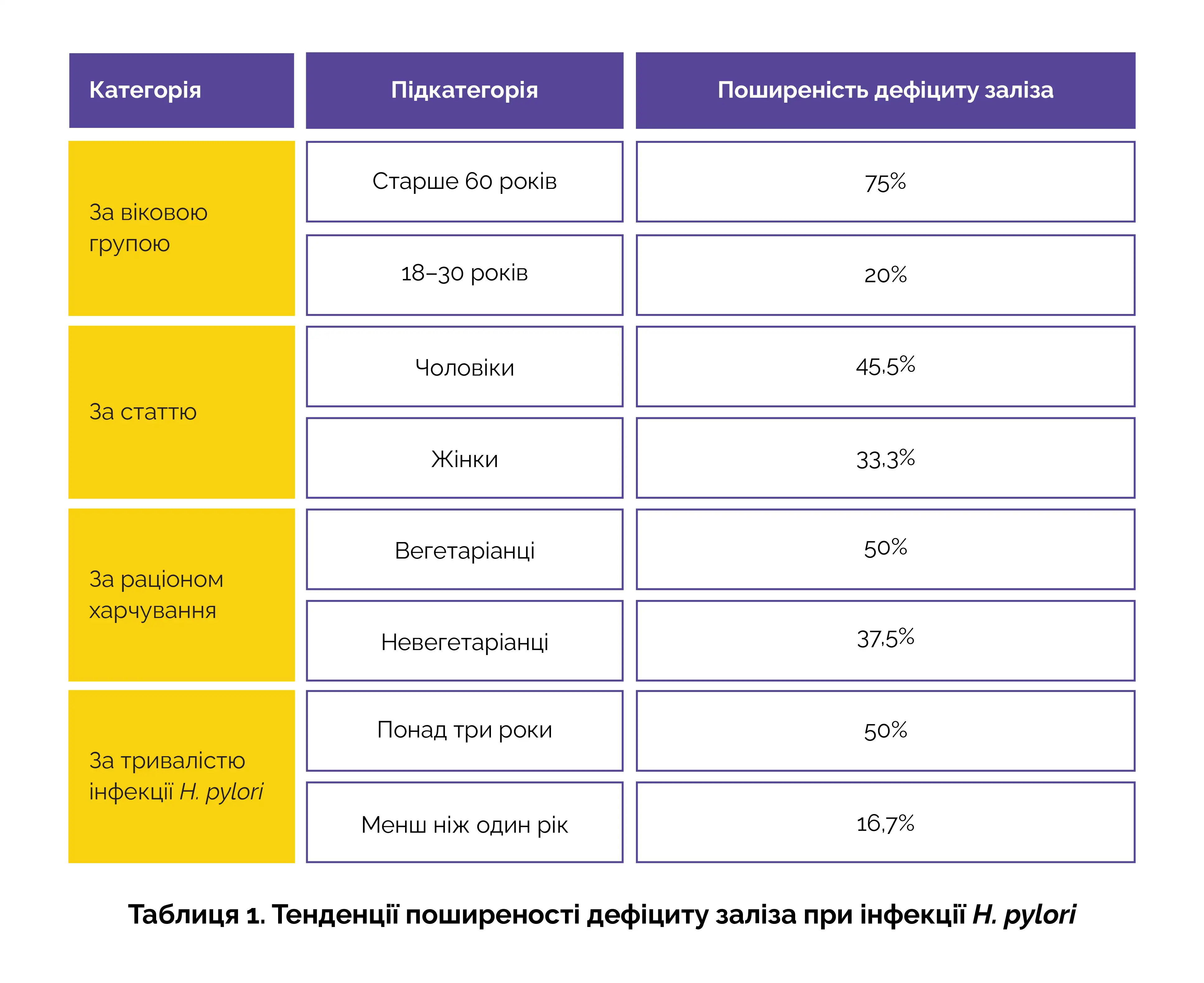 Було проведено збір демографічних даних та аналіз зразків крові. У зразках крові визначали рівні сироваткового феритину та гемоглобіну. Наявність дефіциту заліза виявили у 40 % учасників. У учасників з дефіцитом заліза рівень гемоглобіну був значно нижчим, у середньому 10,8 ± 0,9 г/дл. За допомогою логістичного регресійного аналізу було встановлено значний зв'язок між дефіцитом заліза та віком (відношення шансів (ВШ) – 1,05) та тривалістю інфекції (ВШ – 1,10). Інші тенденції поширеності дефіциту заліза при інфекції H. pylori представлені у таблиці 1.