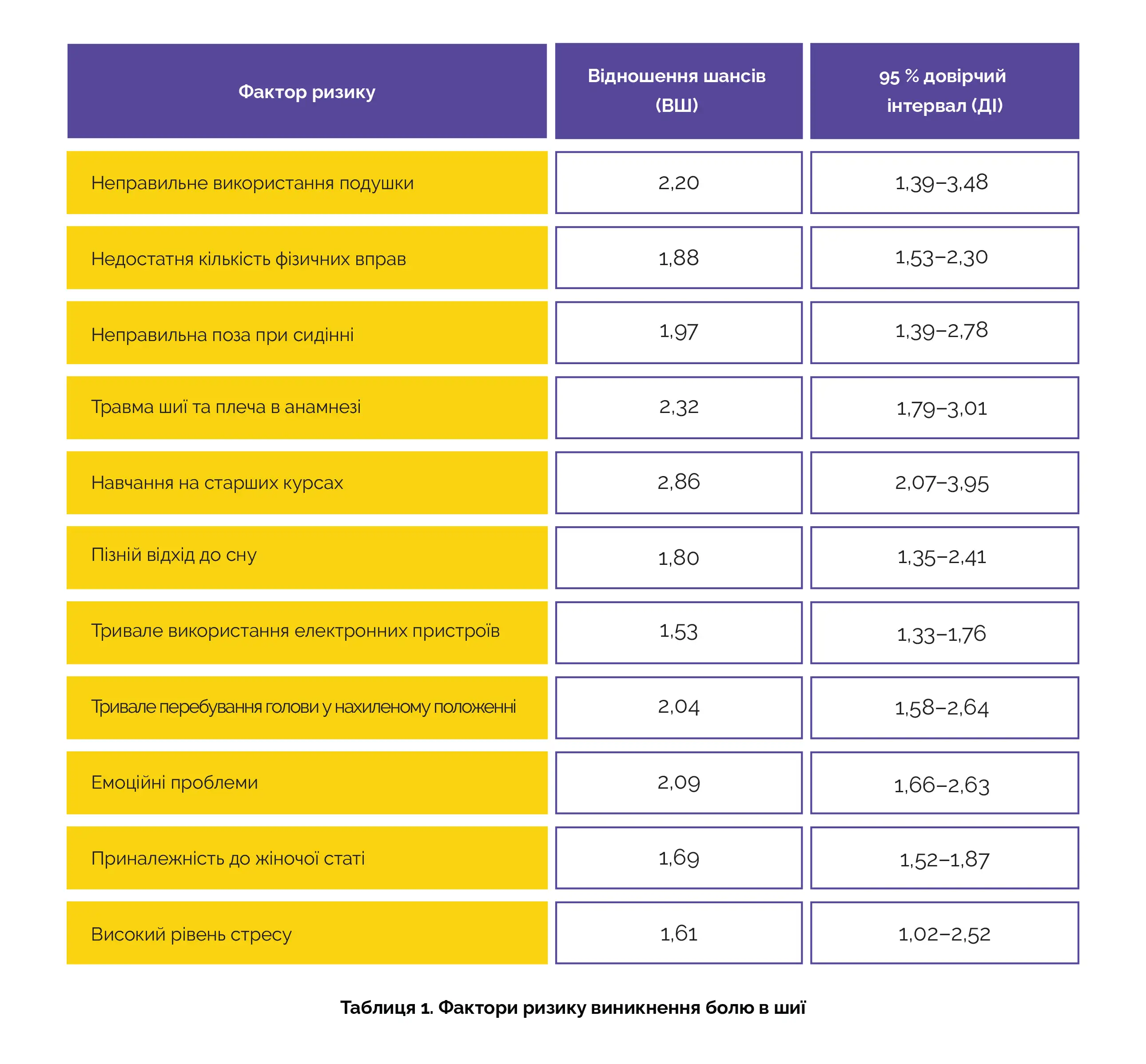 Переважними серед цих факторів були неправильне використання подушок, недостатня кількість фізичних вправ, неправильна поза при сидінні, травми шиї та плечей в анамнезі, навчання на старших курсах, пізній відхід до сну, тривале щоденне використання електронних пристроїв тривалі періоди перебування голови у нахиленому положенні та емоційний стрес. Фактори ризику з помірним ступенем підтвердження включали належність до жіночої статі та високий рівень стресу (таблиця 1).