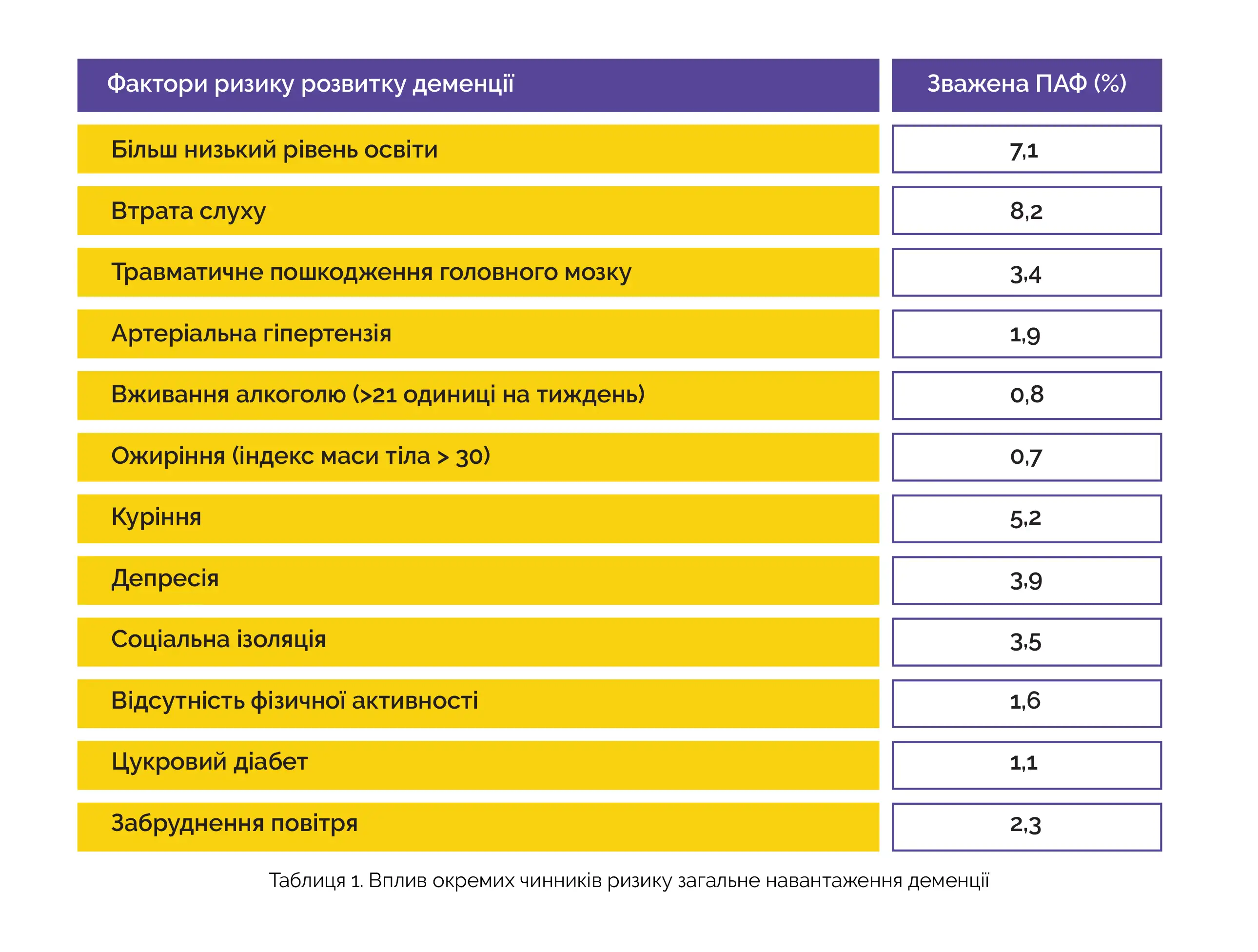Дослідники вивчили внесок кожного чинника ризику у розвиток деменції, виражений як популяційна атрибутивна фракція (ПАФ). Докази того, що втрата слуху є одним із найважливіших факторів ризику розвитку деменції, дуже переконливі. Втрата слуху найбільше впливала на частоту розвитку деменції. За нею слідували нижчий рівень освіти в осіб молодого віку та куріння (див. таблицю 1).