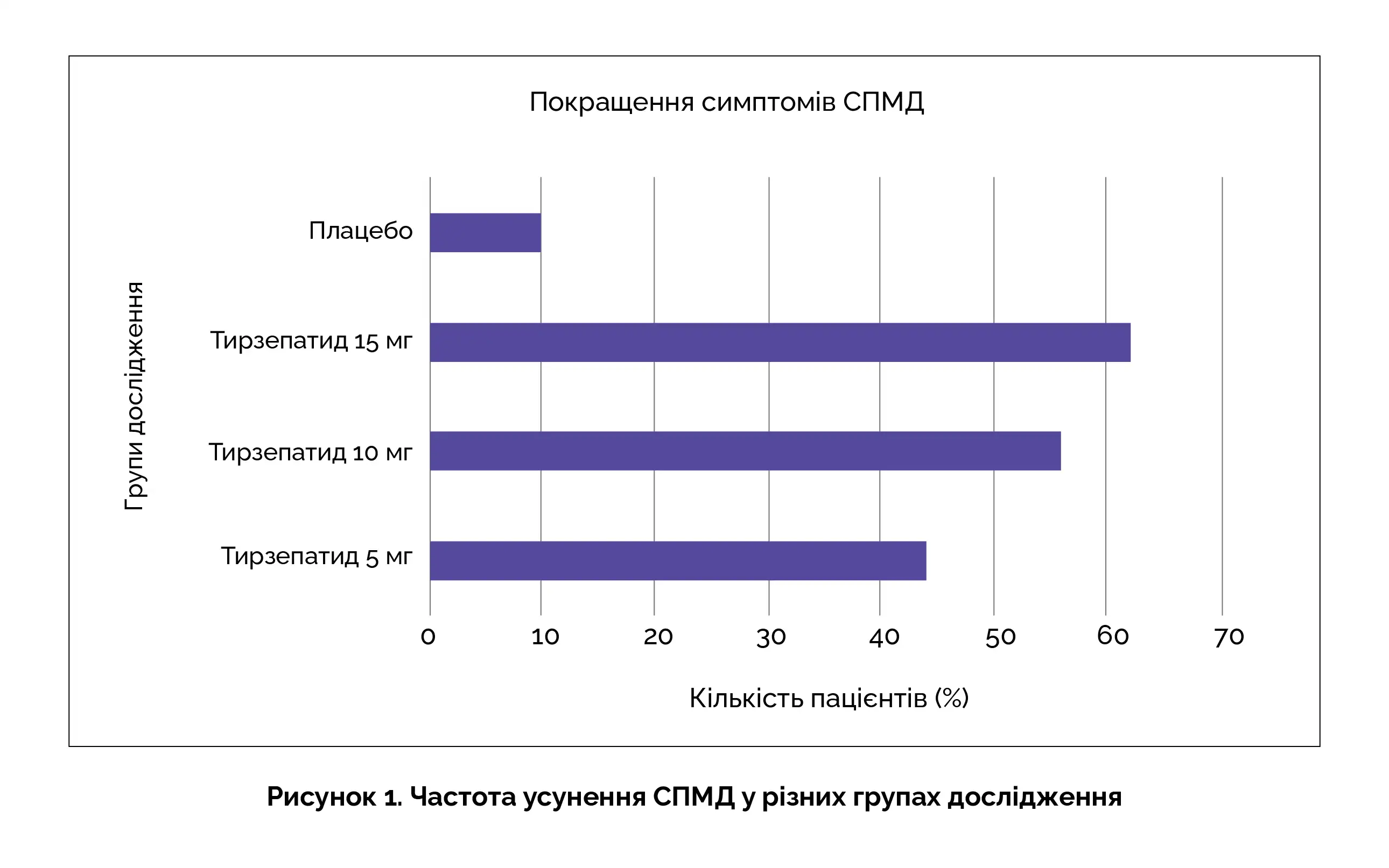 Результати свідчать про значно більшу ефективність тирзепатиду порівняно з плацебо. Усунення СПМД без прогресування фіброзу спостерігалося лише у 10 % учасників у групі плацебо порівняно з 44, 56 та 62 % у групах тирзепатиду у дозі 5 мг, 10 мг та 15 мг відповідно (див. малюнок 1).