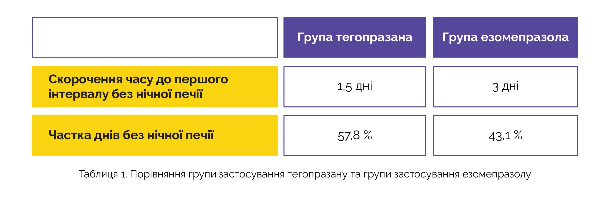 До дослідження було включено 46 пацієнтів. Застосування тегопразану було пов'язане з більш виразним скороченням часу до першого інтервалу без нічної печії в порівнянні з езомепразолом, але відмінність не була клінічно значущою. У групі застосування тегопразану частка ночей без печії була вищою, однак різниця між групами не була статистично значущою (див. таблицю 1).