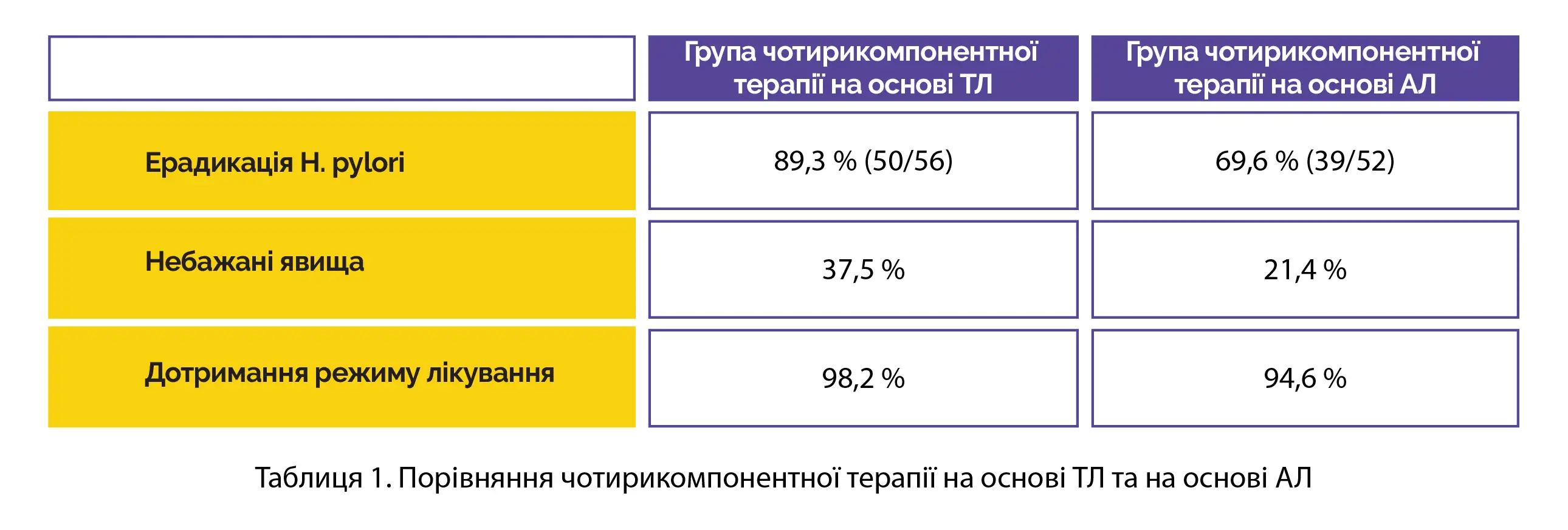 Згідно з результатами аналізу, що виконується виходячи з припущення, що всі пацієнти отримали призначене лікування, у групі чотирикомпонентної терапії інфекції H. pylori на основі ТЛ були виявлені більш сприятливі результати порівняно з групою чотирикомпонентної терапії на основі АЛ. У групах чотирикомпонентної терапії як на основі ТЛ, так і на основі АЛ спостерігалася зіставна частота розвитку небажаних явищ та ступінь дотримання режиму лікування (таблиця 1).