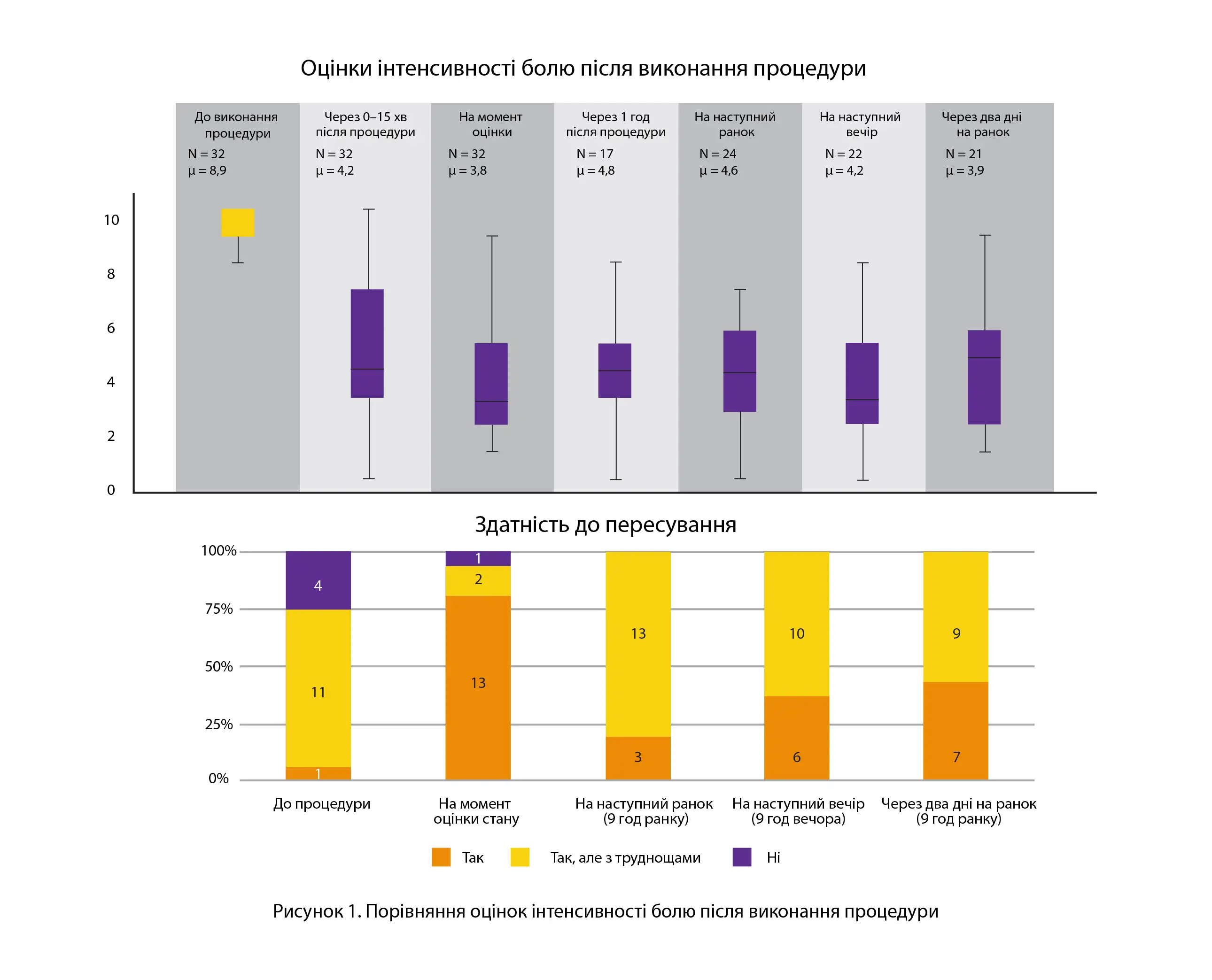 Через 15-30 хвилин після виконання блокади оцінка інтенсивності болю (за шкалою від 0 до 10 балів) у пацієнтів знизилася в середньому на 4,72 бали. У 71,9% (у 23 із 32) пацієнтів після виконання блокади було відзначено покращення результатів у тесті TUG. При цьому у 25% (у 8 із 32) пацієнтів поліпшення результатів у тесті TUG не спостерігалося, а у 3,1% (у 1 із 32) пацієнтів було відзначено погіршення результатів у тесті TUG. До виконання ТГБСН медичні працівники вважали, що стан 50% (16 із 32) пацієнтів потребує госпіталізації чи переведення до палати інтенсивного спостереження. Однак після виконання блокади госпіталізація або переведення до палати інтенсивного спостереження знадобилося лише 19 % (6 із 32) пацієнтів. Дані про оцінки інтенсивності болю та здатності до пересування, отримані протягом 72 годин після виконання блокади, наведено на малюнку 1.