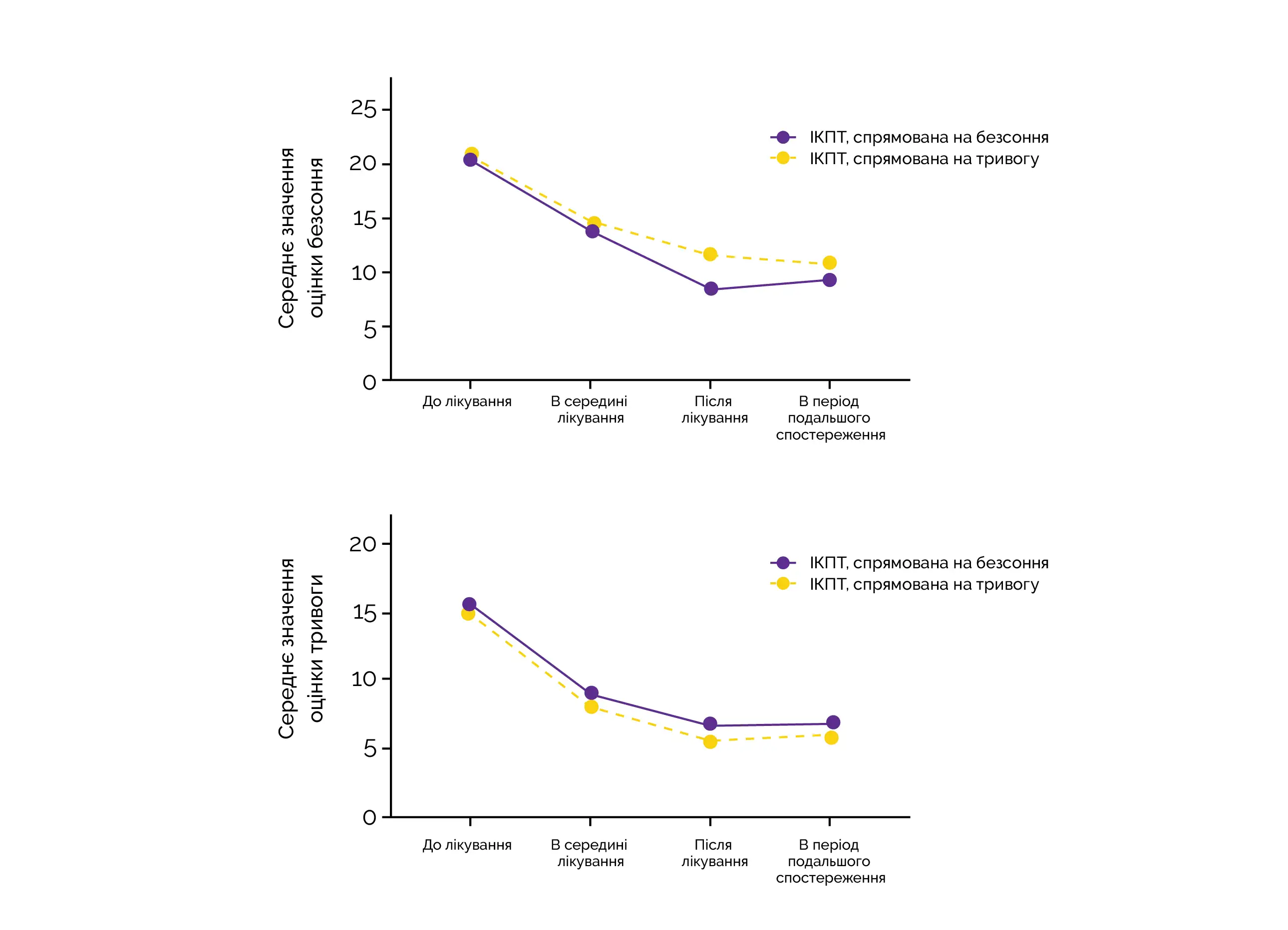 Учасники з обох груп повідомили про значне зниження виразності симптомів тривоги, безсоння, депресії та рівня стресу, а також про покращення загальної якості та тривалості сну. Досягнуте поліпшення зберігалося і під час наступного спостереження. На момент завершення дослідження була встановлена більш висока ефективність лікування, спрямованого на усунення безсоння, що виражалося в мінімальній виразності симптомів безсоння та порівнянній успішності зниження симптомів тривожності, порівняно з лікуванням, спрямованим на усунення тривоги (рисунок 1).