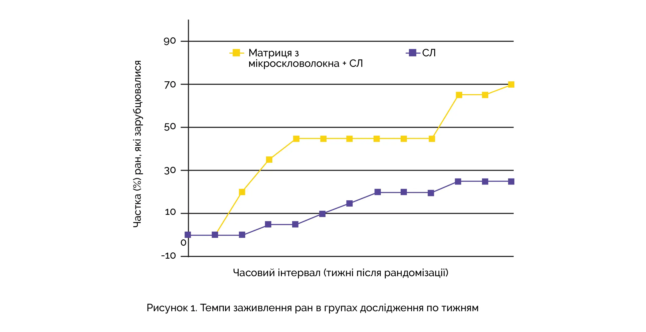Додатковими кінцевими точками були відносне зменшення площі рани (ВЗПР) та зміна результату випробувань моноволокна Семмеса - Вайнштейна. Згідно з результатами оцінки всіх пацієнтів, які отримали лікування, на 12-му тижні в групі застосування матриці, що розсмоктується, зі скловолокна + СЛ загоєння виразок діабетичної стопи було відзначено у більшої частки пацієнтів, ніж у групі СЛ (70 % (14/20) і 25 % ( 5/20) відповідно) (див. рисунок 1).