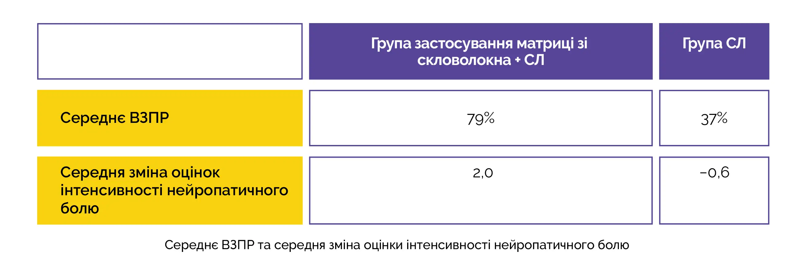 Середнє ВЗПР на 12-му тижні і середня зміна оцінок інтенсивності нейропатичного болю в період від вихідного рівня до 12-го тижня терапії були вищими в групі застосування матриці зі скловолокна + СЛ, що розсмоктується, ніж у групі СЛ (див. таблицю 1).
