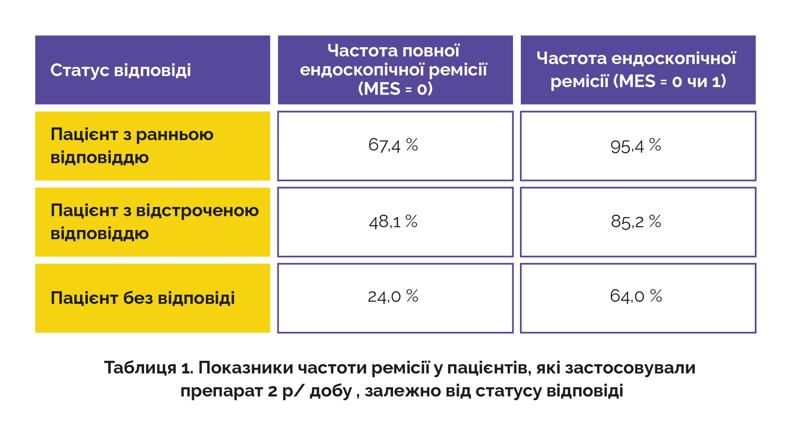 Більшість пацієнтів, у яких спостерігалася рання відповідь, досягли ендоскопічної ремісії на 6-й тиждень, незалежно від схеми застосування препарату. У пацієнтів із ранньою відповіддю сукупний період без рецидивів був найбільш тривалим серед усіх груп (p = 0,07). За результатами дослідження було зроблено висновок, що застосування будесоніду в формі піни двічі на добу ефективніше за його застосування один раз на добу щодо досягнення раннього полегшення симптомів та ендоскопічної ремісії у пацієнтів з ВК та забезпечує більш сприятливі довгострокові наслідки після закінчення лікування.