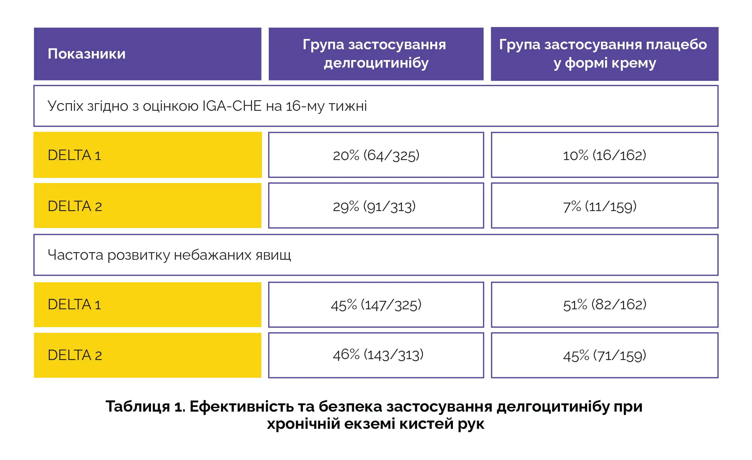 Основною заздалегідь визначеною кінцевою точкою був клінічний успіх згідно з загальною оцінкою дослідником тяжкості хронічної екземи кистей (IGA-CHE) на 16-му тижні. Отримані результати вказували на те, що серед учасників, які отримували лікування делгоцитинібом у дослідженнях DELTA 1 та 2, частка пацієнтів, які досягли оцінки «чиста або практично чиста шкіра», була суттєво вищою, ніж у групах застосування плацебо у формі крему. Дані безпеки вказували на подібну частоту розвитку небажаних явищ у двох групах, при цьому найбільш поширеними з них були COVID-19 і назофарингіт (таблиця 1).