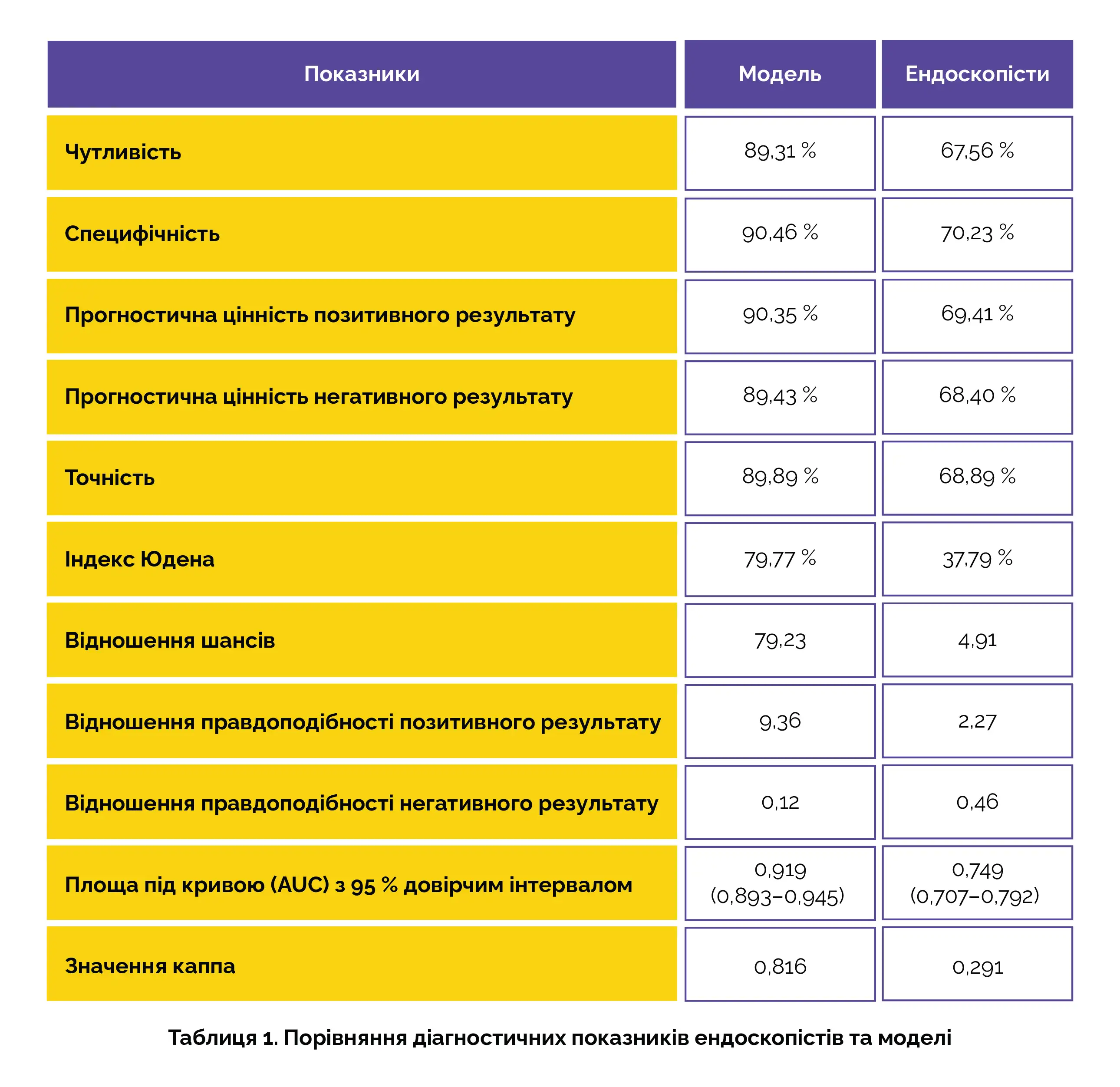 У дослідження було включено загалом 1306 учасників, розділених на дві групи: групу пацієнтів з ХАГ та групу пацієнтів із хронічним неатрофічним гастритом на підставі результату патоморфологічного дослідження. Потім у кожній групі оцінювали показники діагностики. Модель автоматично маркувала кожну ділянку атрофії та оцінювала її тяжкість. Щоб усунути потенційну систематичну помилку відбору, дослідники використали зіставлення показників схильності. Була встановлена більша ефективність моделі з точки зору показників діагностичної оцінки та краща узгодженість діагнозів, отриманих за її допомогою, зі стадіюванням за системою OLGA порівняно з ендоскопістами (див. таблицю 1).