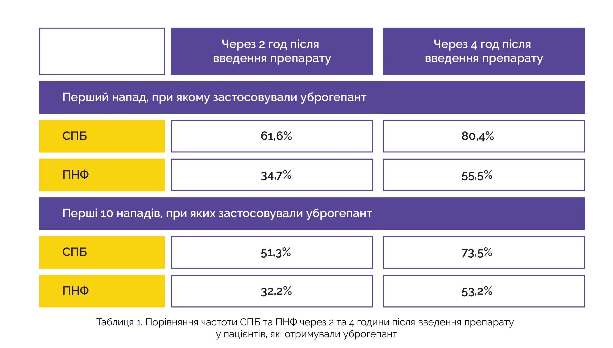 У групі лікування уброгепантом у комбінації з МАТ до CGRP реєстрували дані про перший напад мігрені, купіруваний уброгепантом, і про перші десять нападів мігрені, при яких застосовувався уброгепант. Загалом 245 пацієнтів повідомили про використання уброгепанта у комбінації з МАТ до CGRP для усунення нападу мігрені; в аналіз були включені дані про 1153 напади, при яких застосовувався уброгепант. У таблиці 1 наведено дані про частку добровольців, які досягли СПБ і ПНФ через 2 і 4 години після введення препарату, на момент першого і перших 10 нападів, при яких застосовувався уброгепант.
