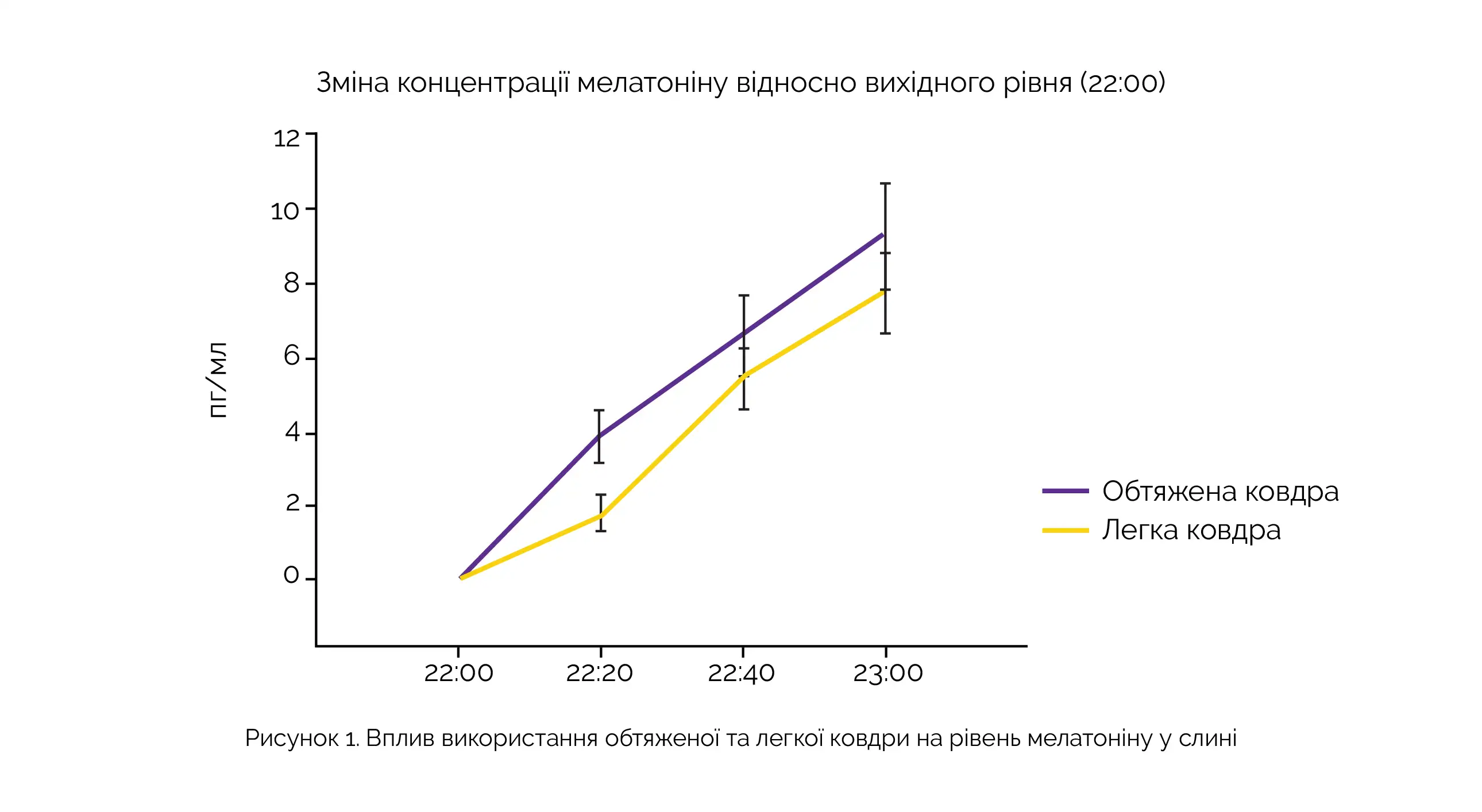 У дослідженні оцінювали потенційний вплив таких факторів, як тривалість сну, суб'єктивна сонливість, активність альфа-амілази у слині (як індикатор впливу на симпатичну нервову систему). При використанні обтяженої ковдри протягом однієї години від вихідного рівня (22:00) до моменту вимкнення світла (23:00) підвищення концентрації мелатоніну в слині було більш вираженим (приблизно на 32%) (див. рис. 1).