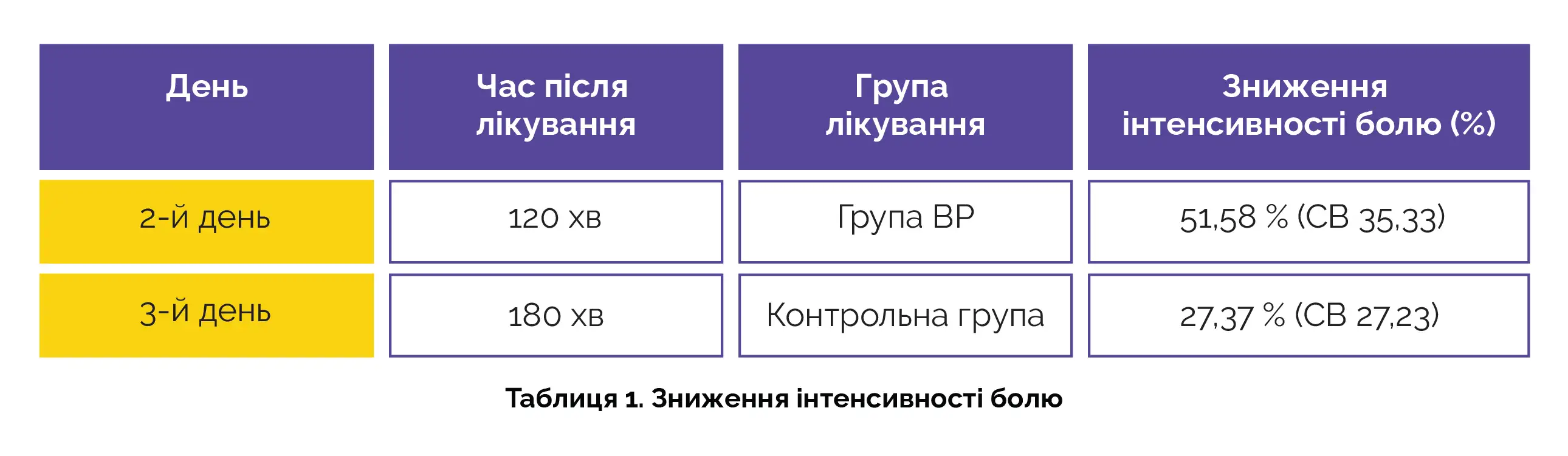 Найбільш значуще зниження інтенсивності болю спостерігалося другого дня через 120 хвилин після сеансу терапії в групі ВР і на третій день через 180 хвилин після втручання у контрольній групі (таблиця 1).