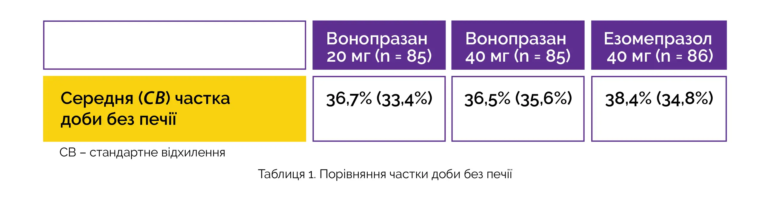 У дослідженні взяли участь 256 пацієнтів (середній вік – 52,6 року; частка жінок – 59,4 %) із симптомами ГЕРХ та частковою відповіддю на застосування езомепразолу в терапевтичній дозі, яких рандомізували до групи застосування вонопразану у дозі 20 мг (n = 85) та 40 мг (n = 85) один раз на добу або до групи застосування езомепразолу в дозі 40 мг 1 раз на добу (n = 86). Статистично значущих відмінностей між групами за середньою часткою доби без печії виявлено не було (див. таблицю 1).