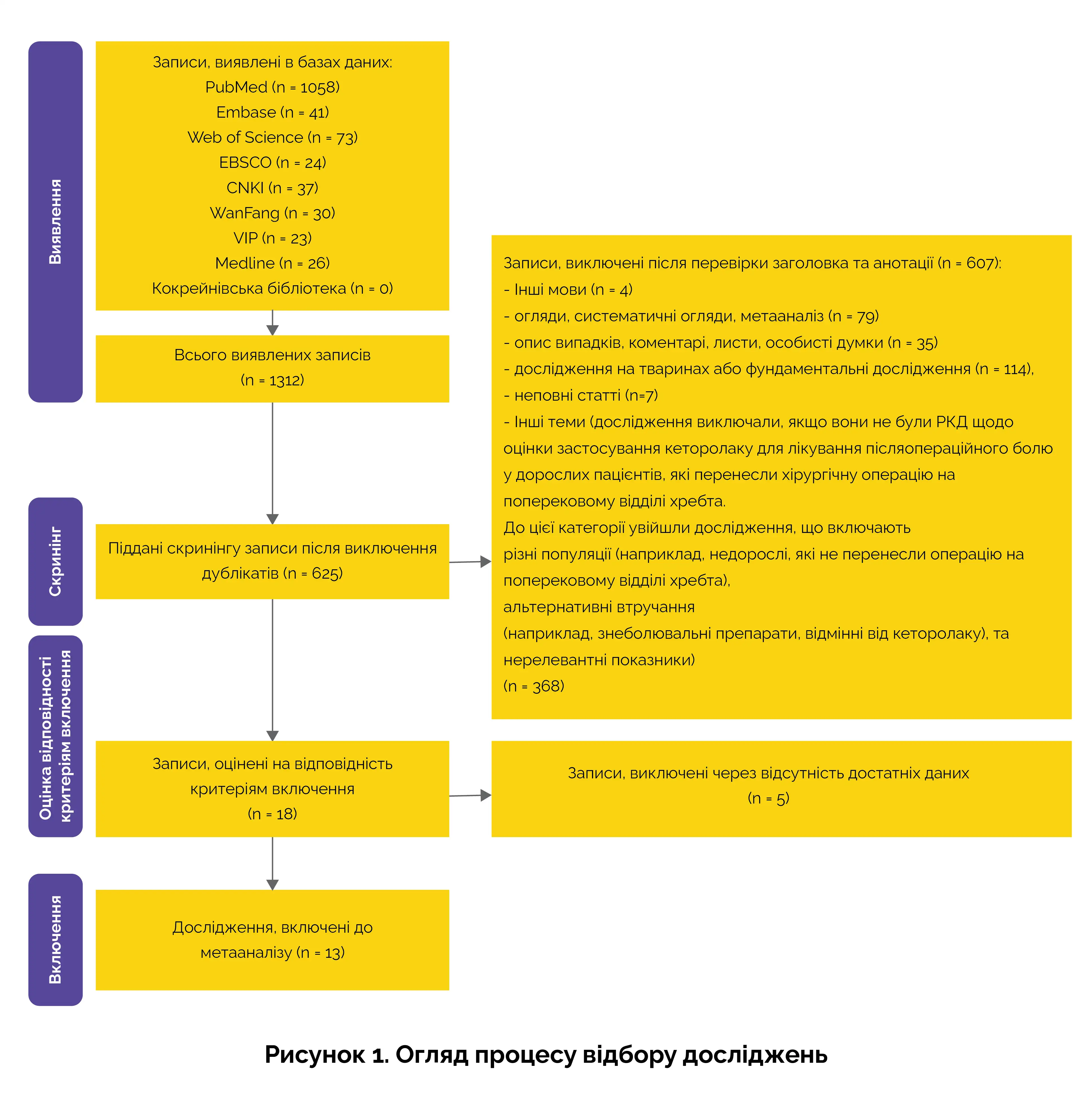 Здійснено систематичний пошук у базах даних, включаючи Кокрейнівську бібліотеку, China National Knowledge Infrastructure (CNKI), Elton B. Stephens Company (EBSCO), Embase, Medline, PubMed, VIP, WanFang та Web of Science, з моменту їх створення до травня 2023 року. При пошуку використовували ключові слова та терміни медичних предметних рубрик (MeSH), такі як "анальгезія", "кеторолак", "хірургічна операція на поперековому відділі хребта", "хірургічна операція на хребті" та "післяопераційний біль". Списки літератури відповідних досліджень та оглядів також переглядали вручну та повторювали процес для виявлення додаткових відповідних критеріїв досліджень. У липні 2024 р. було виконано остаточний пошук, результати якого підтвердили, що до огляду були включені найбільш актуальні дані на момент оцінки.