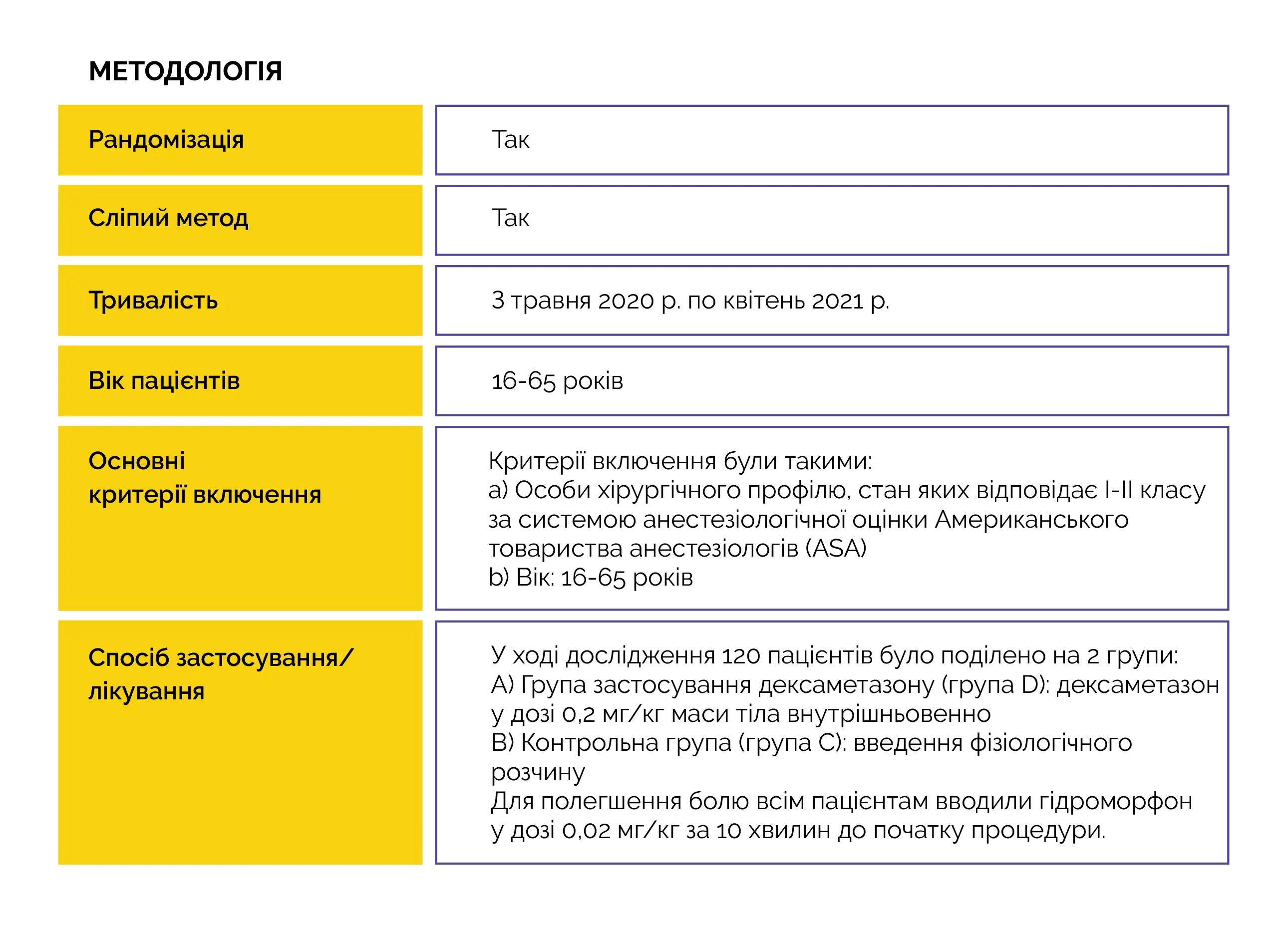 Таким чином, метою цього рандомізованого проспективного подвійного сліпого дослідження Таким чином, метою цього рандомізованого проспективного подвійного сліпого дослідження було вивчення ефективності застосбуло вивчення ефективності застосування дексаметазону з точки зору посилення аналгезії в ування дексаметазону з точки зору посилення аналгезії в післяопераційному періоді, а також профілактики післяопераційних ускладнень у пацієнтів, які післяопераційному періоді, а також профілактики післяопераційних ускладнень у пацієнтів, які перенесли операцію видалення кісти щелепи.перенесли операцію видалення кісти щелепи.
