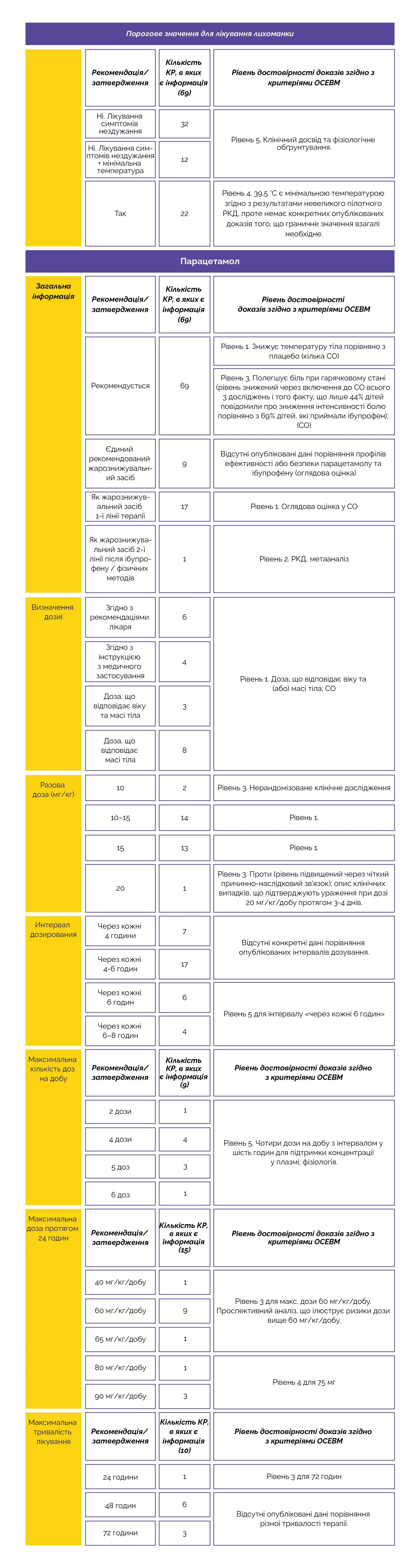 Мета розробки КР полягала у забезпеченні керівництва лікуванням, усуненні розбіжностей між доказами та клінічною практикою з використанням принципів доказової медицини та зниження ірраціонального страху перед лихоманкою та надмірних спроб її придушення. Згідно з результатами огляду семи КР навіть рекомендації, оцінені як високоякісні, не є вичерпними за змістом і не узгоджуються один з одним. Повний спектр рекомендацій щодо лікування лихоманки у дітей досі не визначено. Тому необхідно узагальнити всі рекомендації та оцінити рівень доказовості кожної рекомендації, запропонованої в актуальних КР для лікування лихоманки.