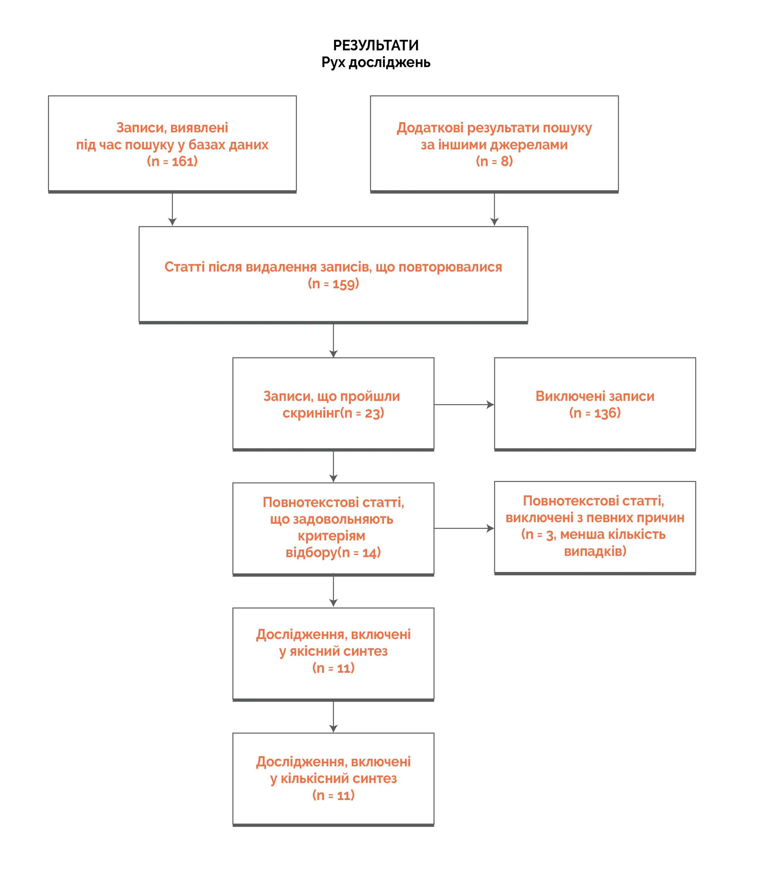 • З 163 статей, що пройшли скринінг, 11 досліджень задовольняли критеріям відбору. Одинадцять відібраних досліджень включали 3 РКД, 6 досліджень серій випадків або обсерваційних досліджень, 1 нерандомізоване контрольоване дослідження з вивченням груп до і після втручання та одне нерандомізоване контрольоване дослідження.