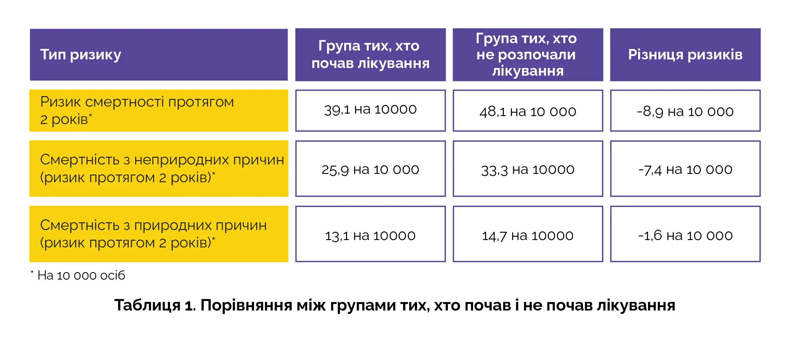 Зі 148 578 пацієнтів із СДУГ 56,7 % розпочали медикаментозну терапію. У пацієнтів, які приймали лікарські препарати, був значно нижчим ризик смертності від будь-яких причин (відношення ризиків (ВР) 0,79), смертності протягом 2 років і смертності від неприродних причин (ВР 0,75). Однак така різниця не була виявлена щодо смертності від природних причин (див. таблицю 1).