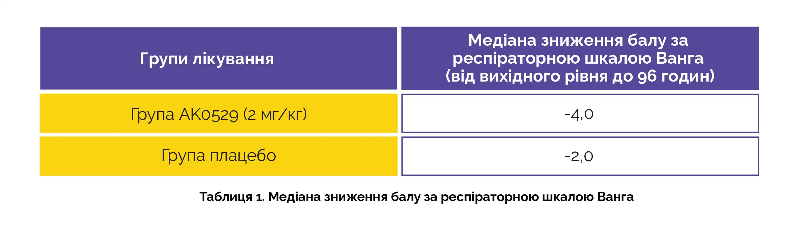 Примітно, що у групі AK0529 спостерігалося значне зниження медіани вірусного навантаження через 96 годин порівняно з групою плацебо. Для порівняння, у групі AK0529 спостерігалося більш виражене зниження балу за респіраторною шкалою Ванга від вихідного рівня до 96 годин порівняно з групою плацебо (таблиця 1).