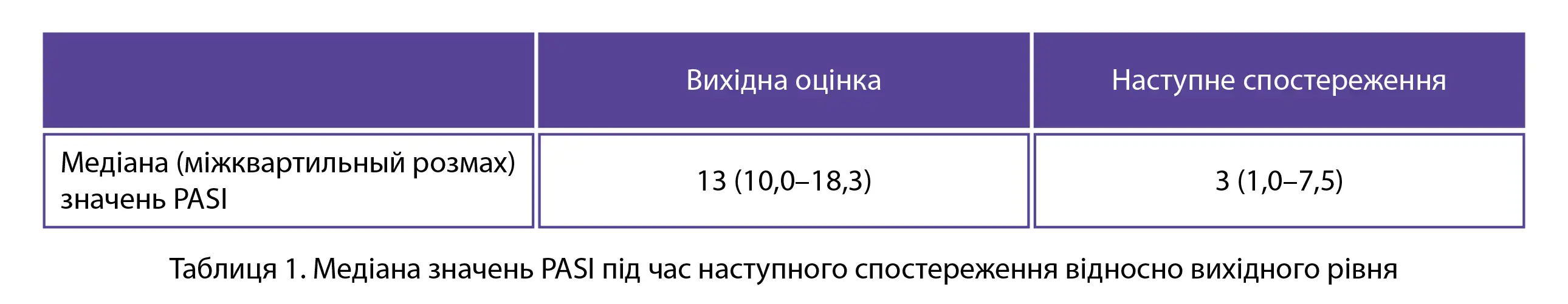 У всій когорті спостерігалося поліпшення медіани (міжквартильного діапазону) значень PASI під час наступного спостереження відносно вихідного рівня.