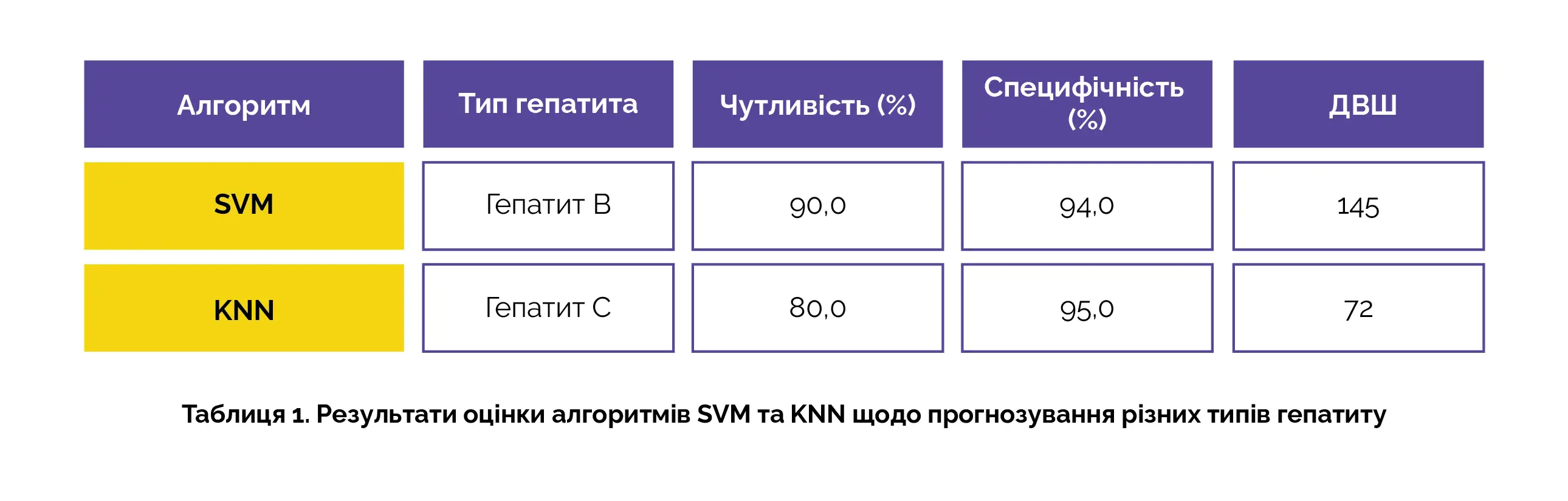 У контексті прогнозування гепатиту B найбільшу чутливість, специфічність і діагностичне відношення шансів (ДВШ) мали алгоритми машини опорних векторів (SVM). З іншого боку, для прогнозування гепатиту C найбільша чутливість, специфічність і ДВШ було зазначено у алгоритмів з урахуванням методу k-найближчих сусідів (KNN) (див. таблицю 1).
