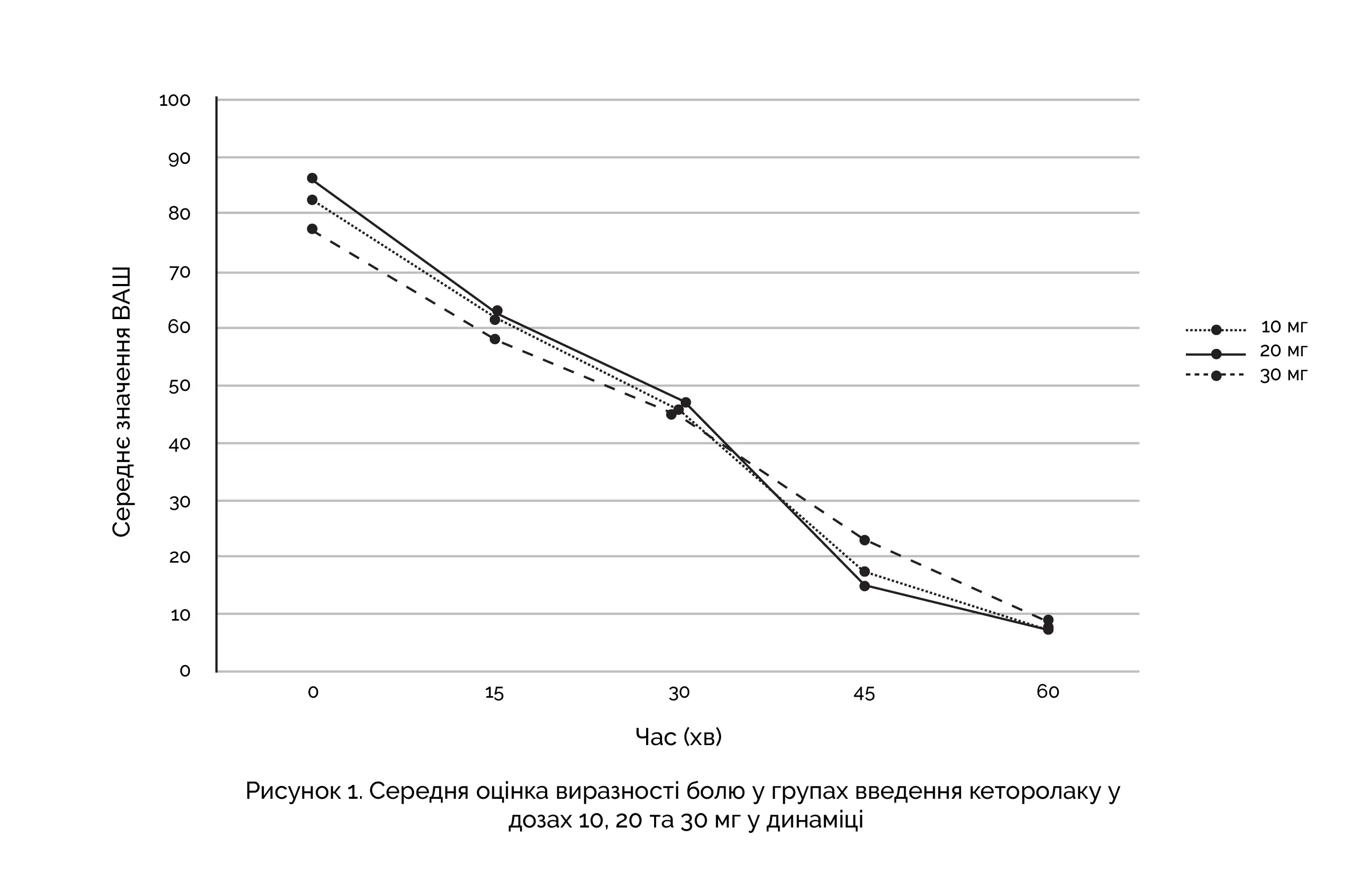 У пацієнтів, які отримували кеторолак у дозі 30 мг, медіана оцінки за візуальною аналоговою шкалою (ВАШ) через 30 хвилин знизилася до 4,0 балів у порівнянні з вихідним рівнем (9,0 балів). У пацієнтів, які отримували кеторолак у дозах 10 та 20 мг, оцінка склала 5,0 та 4,0 бала відповідно. Статистично значущих відмінностей між групами не виявили. У порівнянні з вихідною оцінкою інтенсивності болю у всіх групах спостерігалася статистично значуща відповідь щодо ступеня знеболювання (див. рис. 1).