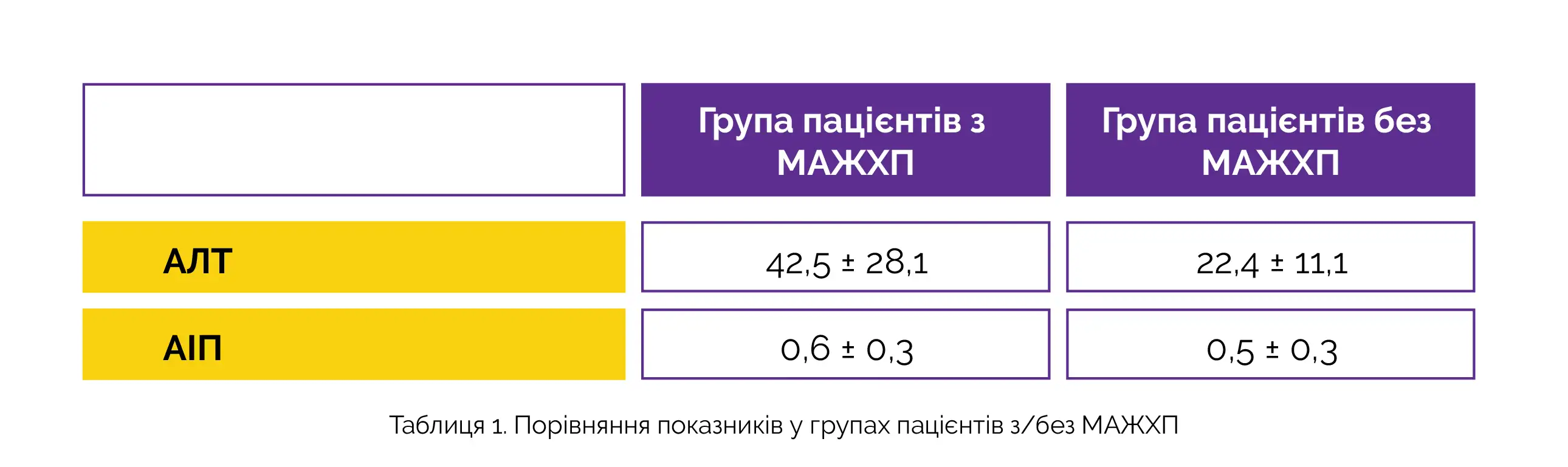 МАЖХП була у 824 з 2547 (32,4%) пацієнтів із ЦД2Т. Згідно з результатами багатофакторного аналізу методом логістичної регресії, виявлено статистично значущі відмінності між пацієнтами залежно від наявності МАЖХП за такими показниками: співвідношення між жінками та чоловіками (1,11 порівняно з 1,33), активність аланінамінотрансферази (АЛТ) та АІП (див. таблицю 1).