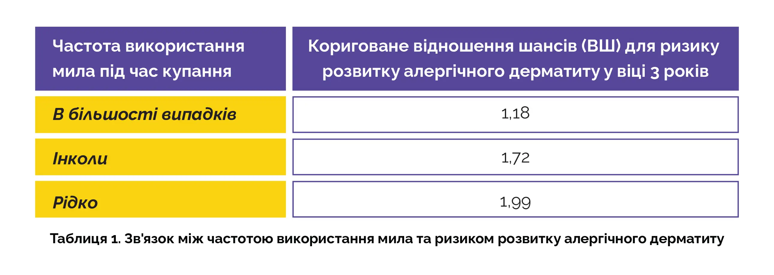В рамках дослідження проаналізували дані 74349 дітей. Більшість дітей віком 18 місяців майже щодня купали чи мили під душем. Згідно з отриманими даними, при менш частому використанні мила під час купання у віці 18 місяців відзначався вищий ризик розвитку алергічного дерматиту у віці трьох років (див. таблицю 1).
