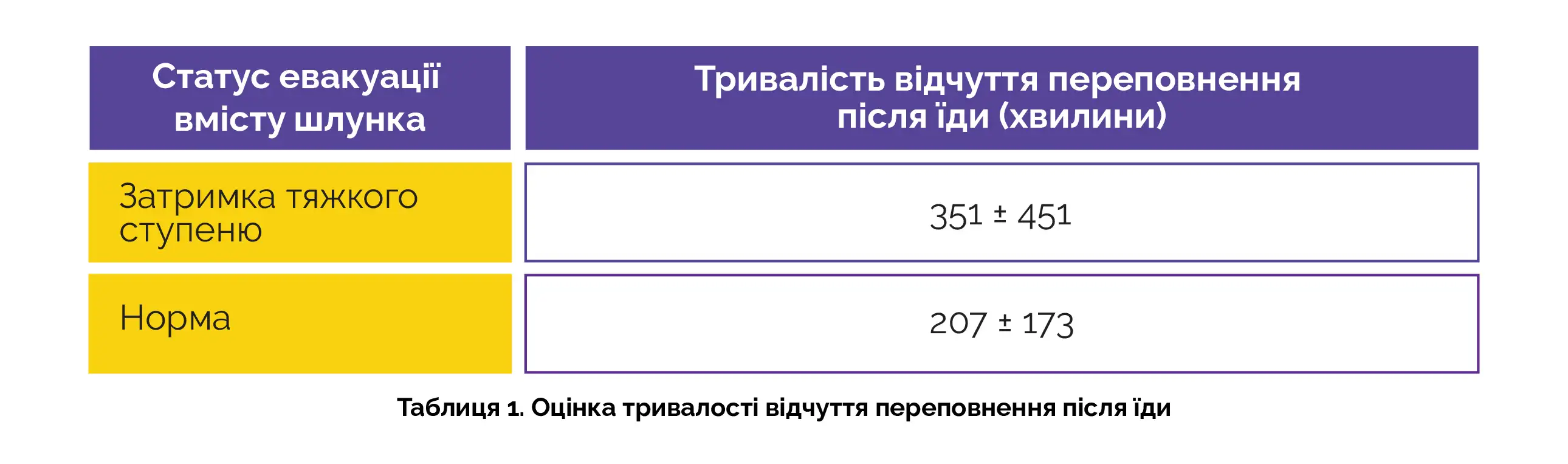 Через погіршення евакуаторної функції шлунка учасники все частіше вносили корективи в дієту, включаючи перехід на дієту з низьким вмістом жирів і клітковини, включення харчових добавок і прийом їжі в подрібненому вигляді (r = 0,309). У пацієнтів із затримкою евакуації вмісту шлунка тяжкого ступеня відчуття переповнення після їди зберігалося протягом більш тривалого періоду порівняно з пацієнтами з нормальною евакуацією вмісту шлунка (див. таблицю 1).