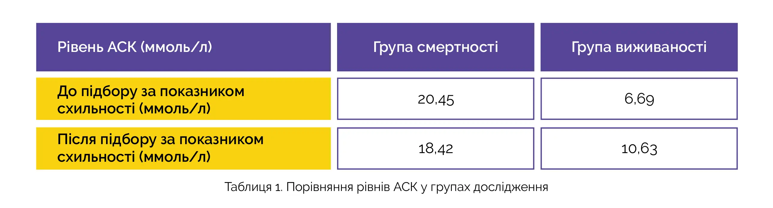 Через 30 днів після госпіталізації смертність від будь-яких причин склала 25,8% (51 пацієнт із 198). У групі смертності рівень азоту сечовини крові (АСК) був статистично значуще вищим у порівнянні з групою виживання як до підбору за показником схильності, так і після нього (див. таблицю 1).