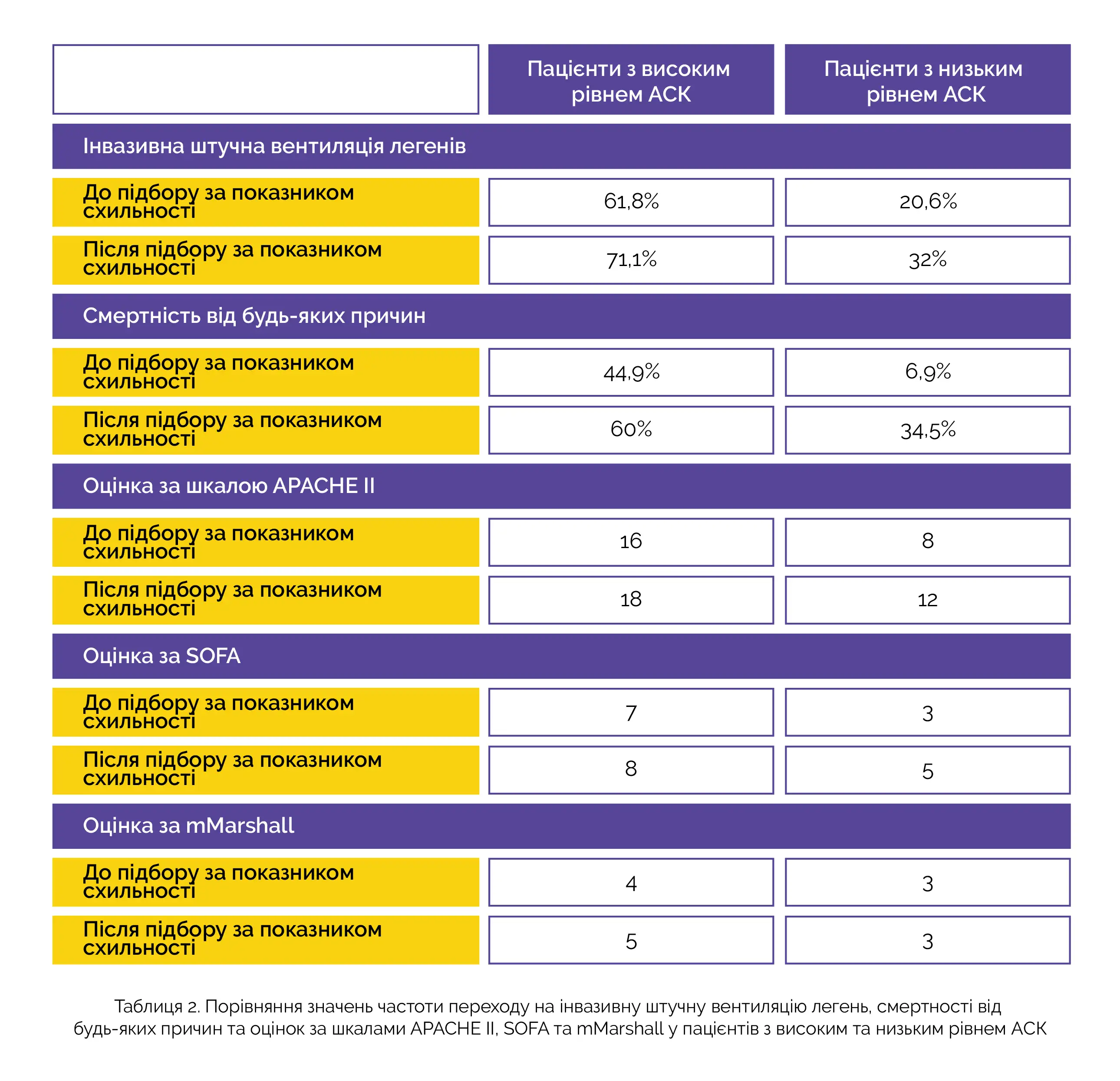 Більш високі значення частоти переходу на інвазивну штучну вентиляцію легень, смертності від будь-яких причин протягом 30 днів, а також оцінок за шкалою гострих фізіологічних розладів та хронічних функціональних змін (APACHE II), за модифікованою шкалою Маршалла (mMarshall) та шкалою динамічної оцінки органу (SOFA) спостерігалися у пацієнтів з високим рівнем АСК порівняно з пацієнтами з низьким рівнем АСК до підбору за показником схильності, а також після нього (див. таблицю 2).
