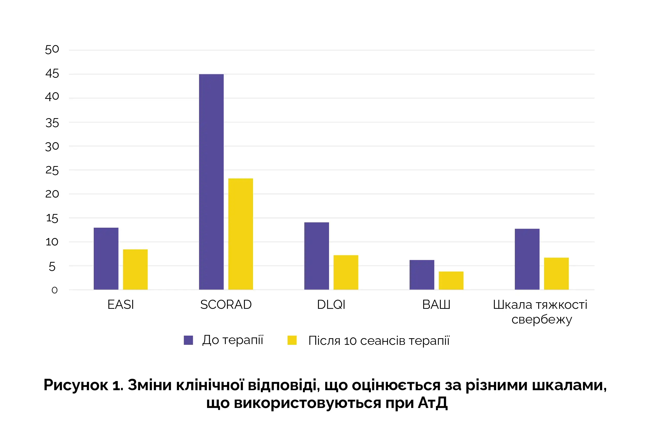 Після десяти сеансів терапії синім світлом значно поліпшилися значення індексу поширеності та тяжкості екземи (EASI; 13,16 порівняно з 8,65; p = 0,00016), оцінки тяжкості атопічного дерматиту (SCORAD; 44,99 порівняно з 23,73; p < 0,00001), оцінки по опитувальнику «Дерматологічний індекс якості життя» (DLQI; 14,37 порівняно з 7,42; p = 0,00351), візуальної аналогової шкалі (ВАШ 6,53 порівняно з 3,95; p = 0,00251) та тяжкості свербежу (13,32 проти 7,05; p < 0,00001) (див. рисунок 1).