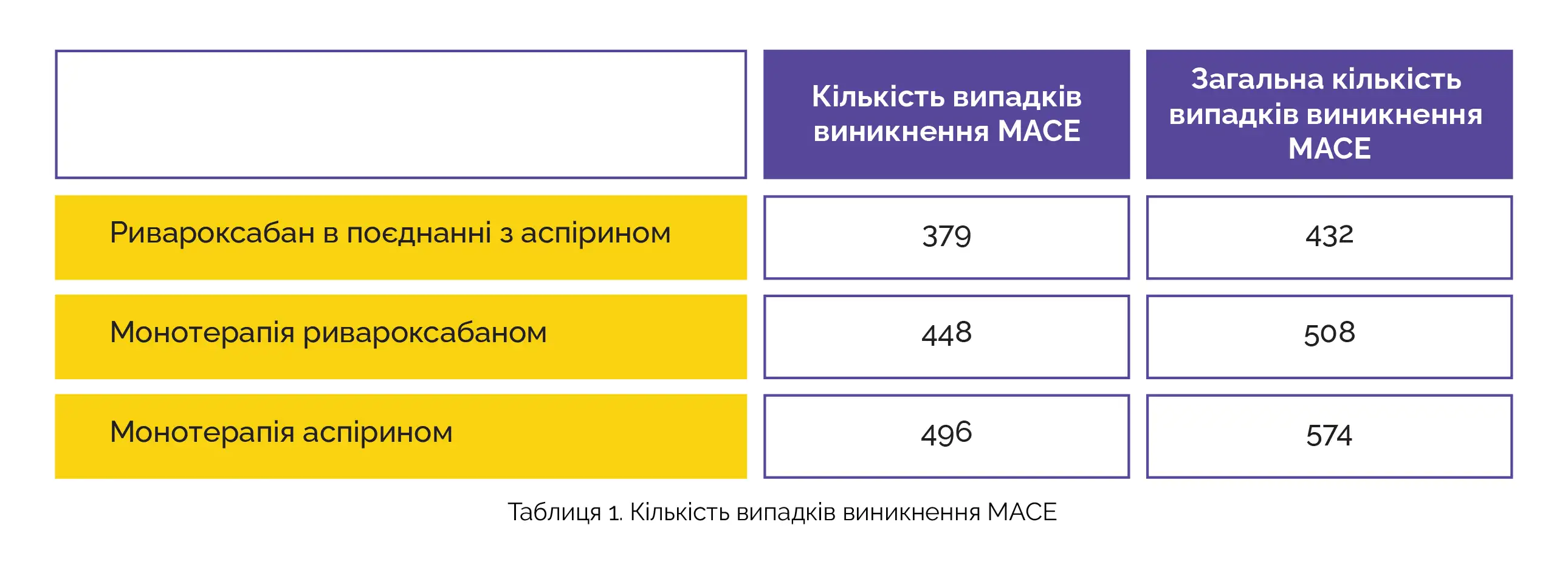 Кількість випадків виникнення MACE була найнижчою у групі комбінованого лікування (дані про кількість подій наведено нижче в таблиці 1).