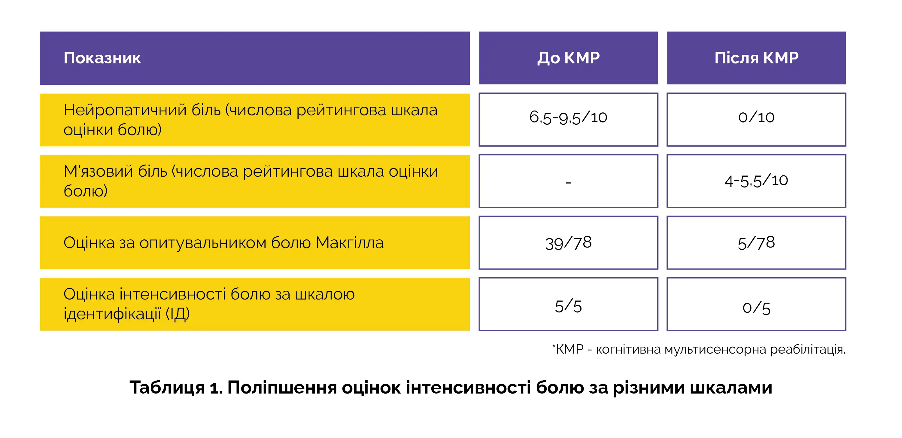 Поліпшення оцінок інтенсивності болю після застосування КМР описано у таблиці 1 нижче: