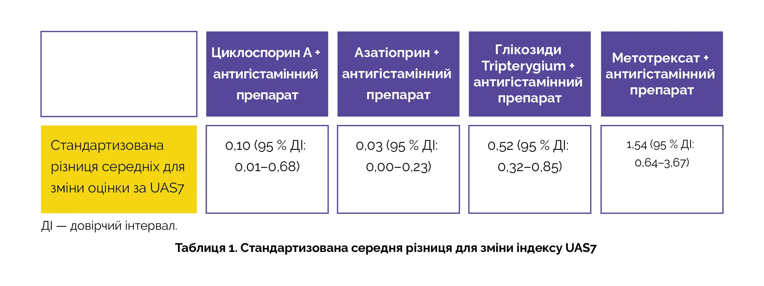 Стандартизовану різницю середніх для зміни індексу UAS7 між групами розраховували на підставі об'єднаних даних семи рандомізованих клінічних досліджень за участю 410 пацієнтів (див. таблицю 1).