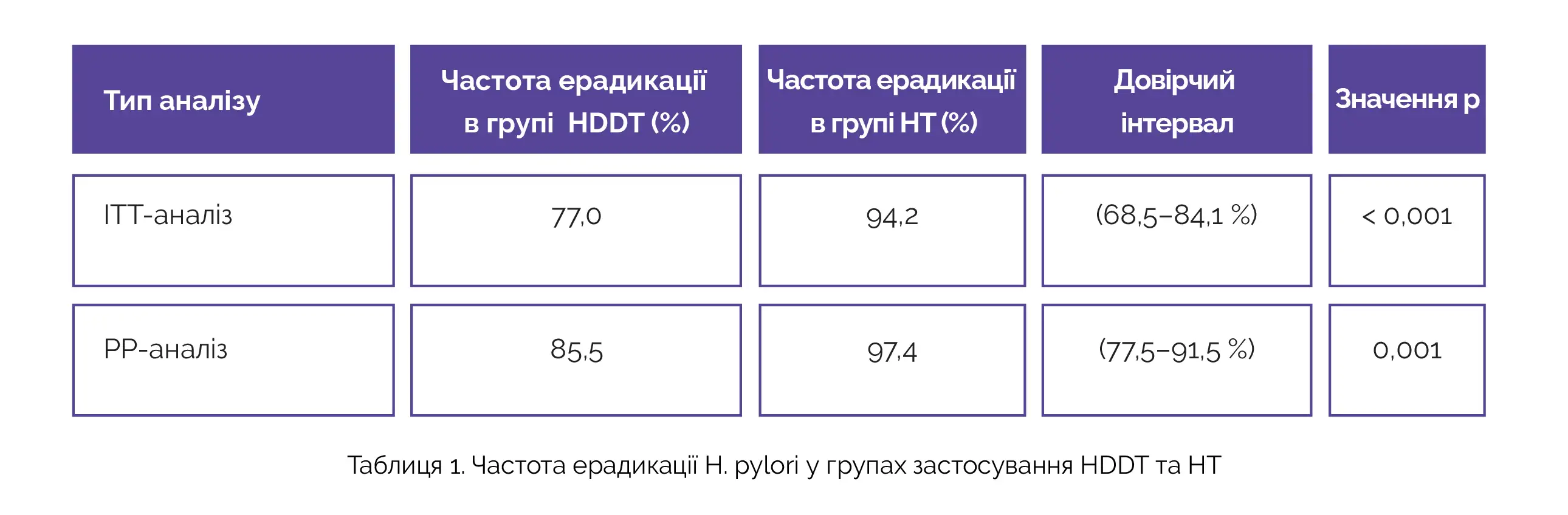 На відміну від HT тривалістю 14 днів, HDDT тривалістю 14 днів, не дозволила досягти частоти ерадикації > 90 % при застосуванні в якості ерадикаційної терапії H. pylori першої лінії.