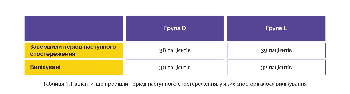 Кількість учасників, які пройшли період наступного спостереження, у яких відзначали вилікування, наведено в таблиці 1.