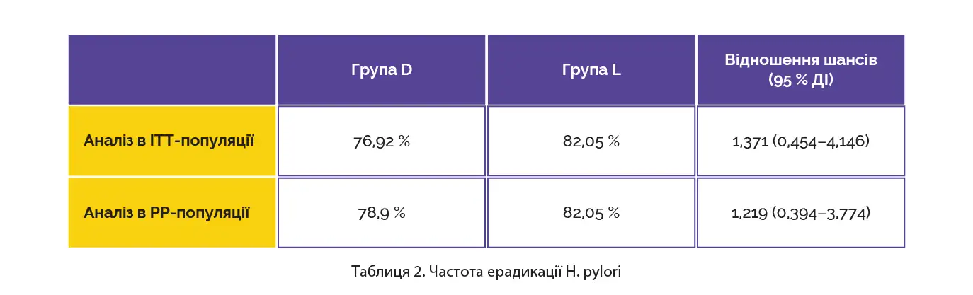 Частоту ерадикації збудника за результатами аналізу, проведеного виходячи з припущення, що всі пацієнти отримали призначене лікування (ITT-популяція), та в популяції пацієнтів, що пройшли лікування за протоколом, наведено в таблиці 2.
