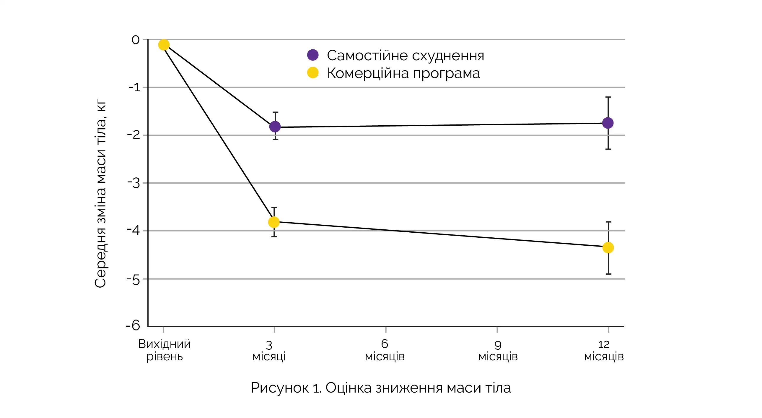 У групі комерційної програми було досягнуто статистично значуще зниження маси тіла за мінімального самоконтролю харчування, що частково узгоджується з вимогами до застосування доказових стратегій поза медичного закладу.