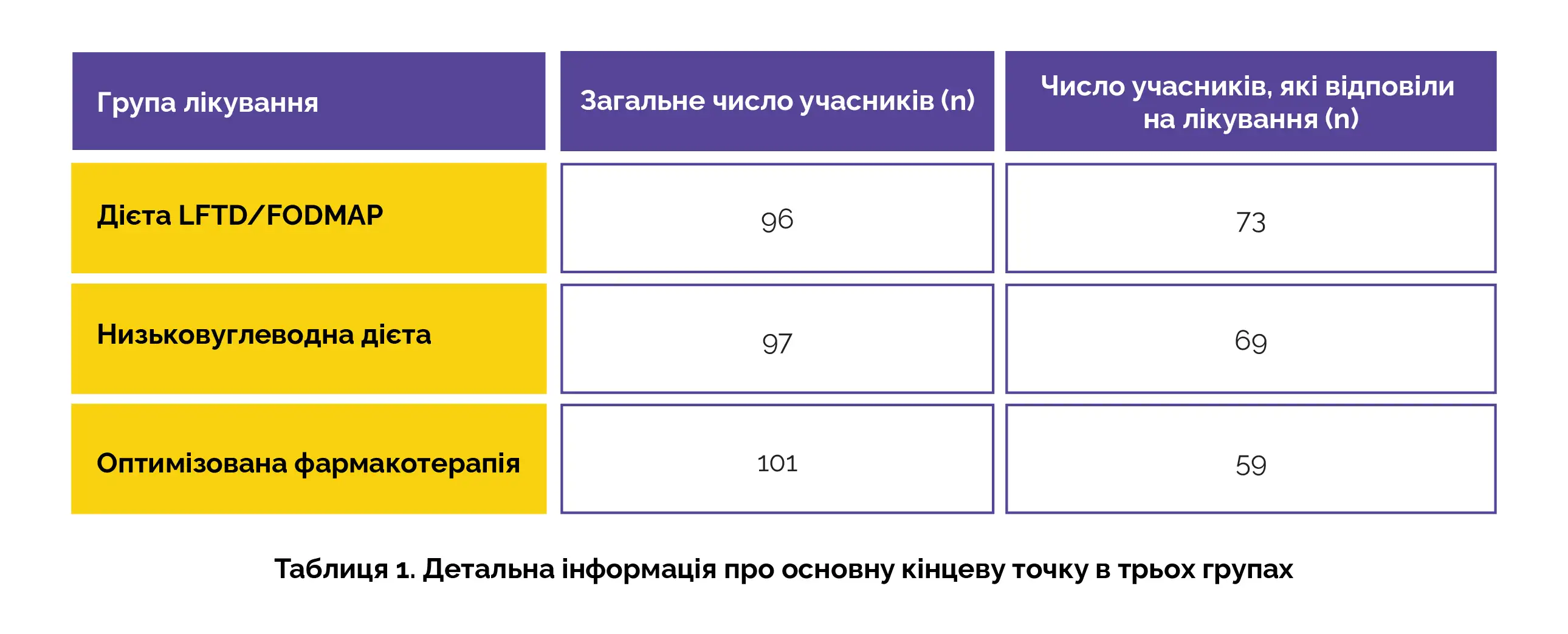 Через 4 тижні статистично значуще зниження оцінки за системою IBS-SSS на ≥ 50 балів було відзначено у 76% учасників групи дотримання дієти LFTD/FODMAP, 71% учасників групи дотримання низьковуглеводної дієти та 58% учасників групи застосування лікарської терапії (таблиця 1).