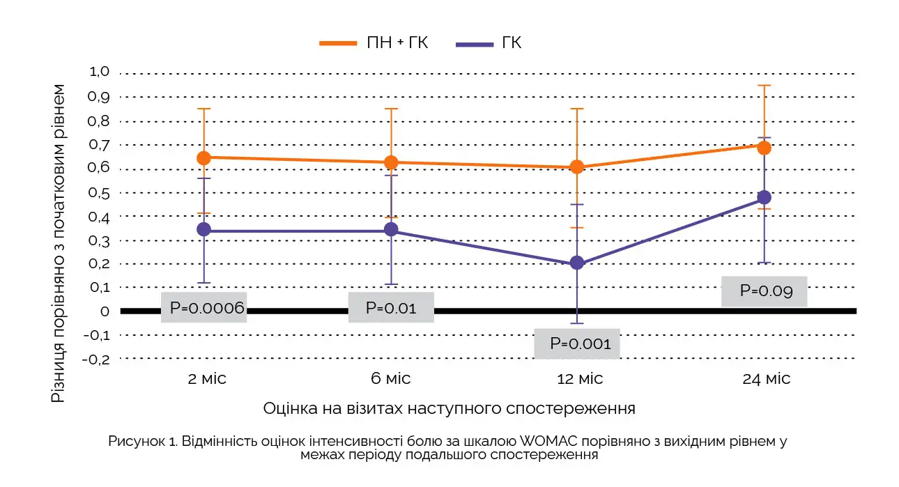 В обох групах спостерігалося статистично значуще покращення оцінки за шкалою KSS. У пацієнтів, які отримували комбінацію ПН + ГК, але не ГК як монотерапію, відзначалося статистично значуще більш виразне полегшення болю. Через 1 рік у пацієнтів, які отримували ПН + ГК, відзначалося статистично значуще збільшення інтенсивності болю за додатковою шкалою WOMAC (див. малюнок 1).
