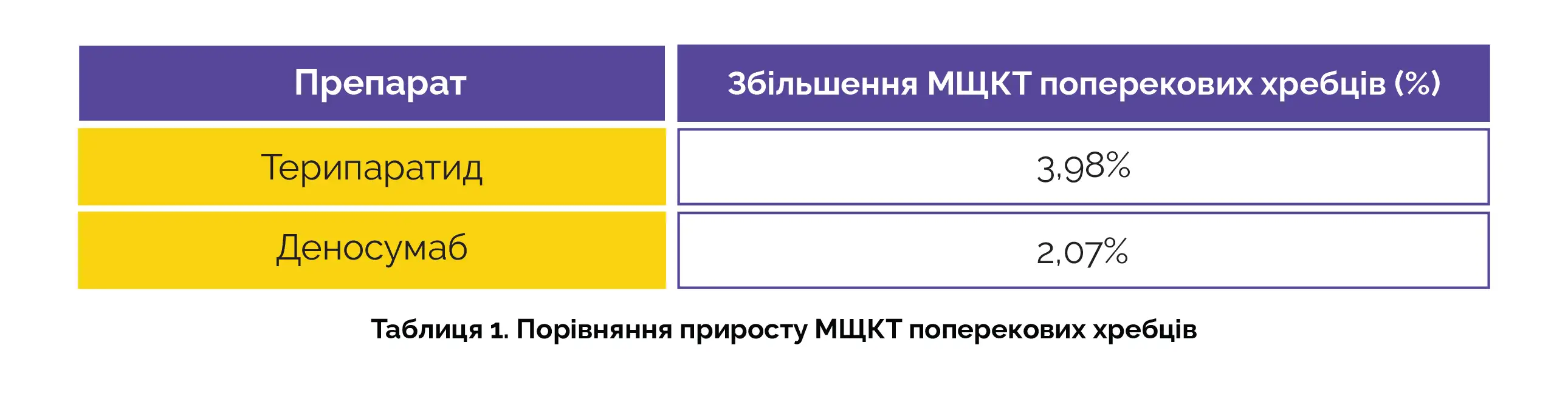 Всього в метааналіз було включено 10 досліджень, до яких увійшли 2923 суб'єкти, які отримували глюкокортикоїди. Усього було проведено 4 аналізи чутливості та 2 оцінки бази даних за лікарськими засобами. Терипаратид і деносумаб перевищують бісфосфонати за критерієм збільшення мінеральної щільності кісткової тканини (МЩКТ) поперекових хребців, як показано в таблиці 1: